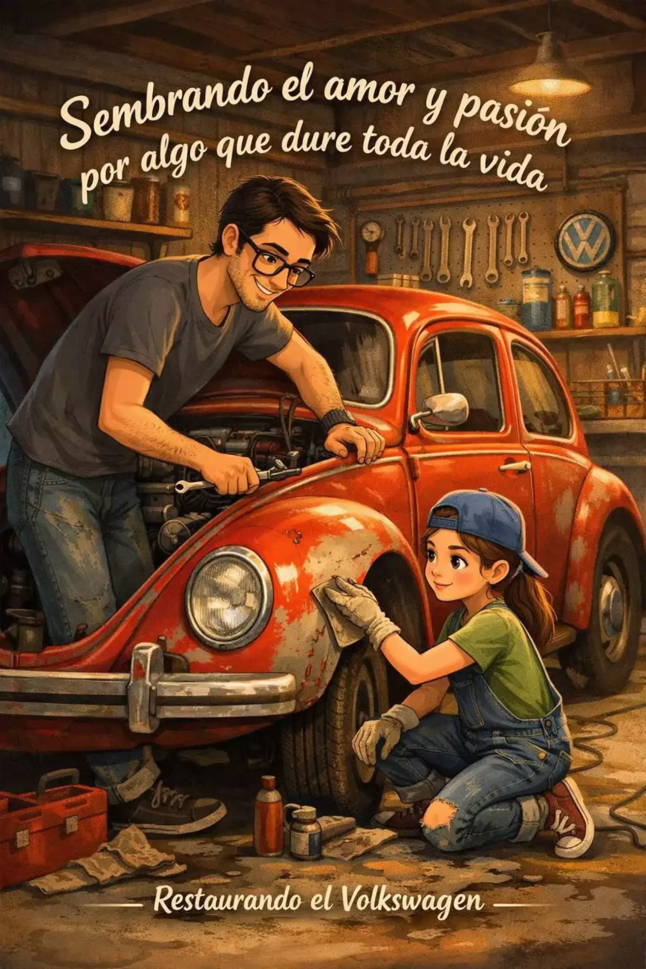 Зображення говорить про передачу захоплень, навичок і цінностей із покоління в покоління. Старий Volkswagen Beetle часто є сімейною реліквією та символом ностальгії.