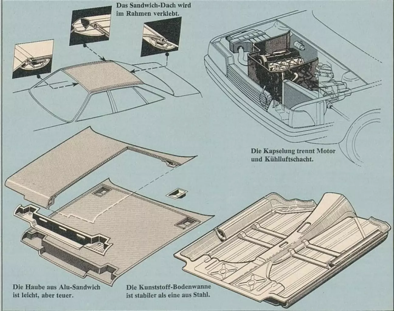 Лишь соединение стали и пластика пока заставляет разработчиков в Ингольштадте ломать голову. Резьбовые соединения приходится дублировать клеевыми. А клеевые швы на несущих деталях автомобиля до сих пор являются «терра инкогнита» в технике. Необходимые адгезивы существуют, однако нужно накопить опыт как в вопросах долговечности, так и в плане внедрения в производственный поток. По этому поводу член совета директоров Фердинанд Пих, решительный сторонник испытаний «сэндвич-конструкций», высказывает дополнительные опасения: «Что произойдет, если я наеду таким пластиковым полом на острый камень? На стали останется безобидная вмятина. Поведение пластика в такой ситуации непредсказуемо». В одном вопросе инженеры, впрочем, уже сегодня настроены оптимистично: акустические свойства пола из стекловолокна и полиэстера более выгодны и лучше поддаются оптимизации. Шумоизоляция здесь может быть интегрирована непосредственно в саму деталь.