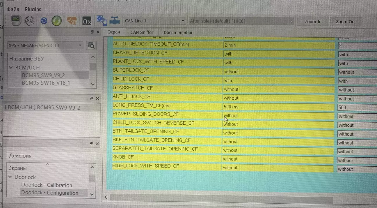 BCU/UCH (Body Control Module) - BCM95_SW9_V9_2 - [BCM/UCH] BCM95_SW9_V9_2 - Doorlock - Doorlock_configuration. В центральном окне находим строку POWER_SLIDING_DOORS_CF и меняем значение with на without. Включаем режим экспорта данных (вверху кнопочка с мордой Эйнштейна) и подтверждаем кнопкой “Send”) в строке справа. Всё, ошибка исчезала! И начал загораться светодиод на кнопке блокировки задних окон. Всё пришло в норму. Осталась только загадкой причина появления этого странного глюка..