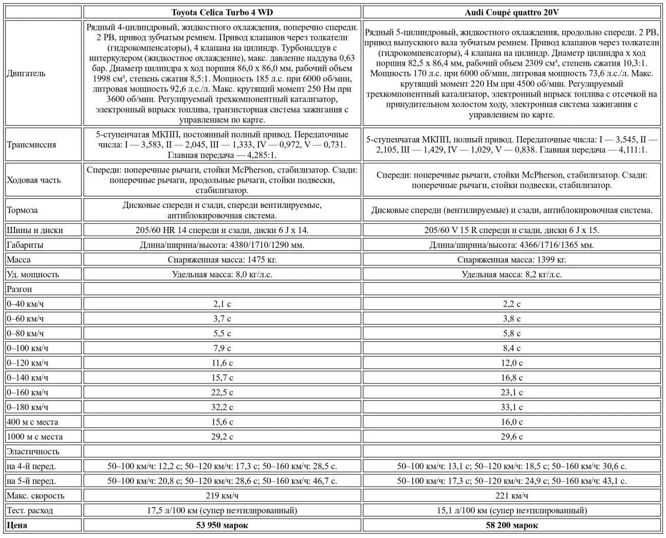 Дизайнерам Audi можно верить на слово: у них перед глазами не висел проспект Toyota, когда они рисовали версию купе на базе седана 90 quattro 20 V. Тем не менее сходство с дальневосточным первопроходцем поразительное. Оба купе полноприводные. Оба двигателя «дышат» через четыре клапана на цилиндр. Их мощность — 170 л. с. и 185 л. с. — находится в одном классе. Впрочем, Toyota представила мощную версию Celica еще в октябре 1986 года, то есть на добрых два года раньше, чем ингольштадтцы показали свое новое купе Quattro. Audi, конечно, могла себе позволить не спешить, ведь предшественница 90-й модели в кузове купе с момента своего появления в 1980 году разошлась тиражом более 169 000 экземпляров. А с легендарной Ur-Quattro, проданной в количестве более 120 000 штук, Audi штурмовала вершины мировых раллийных трасс.