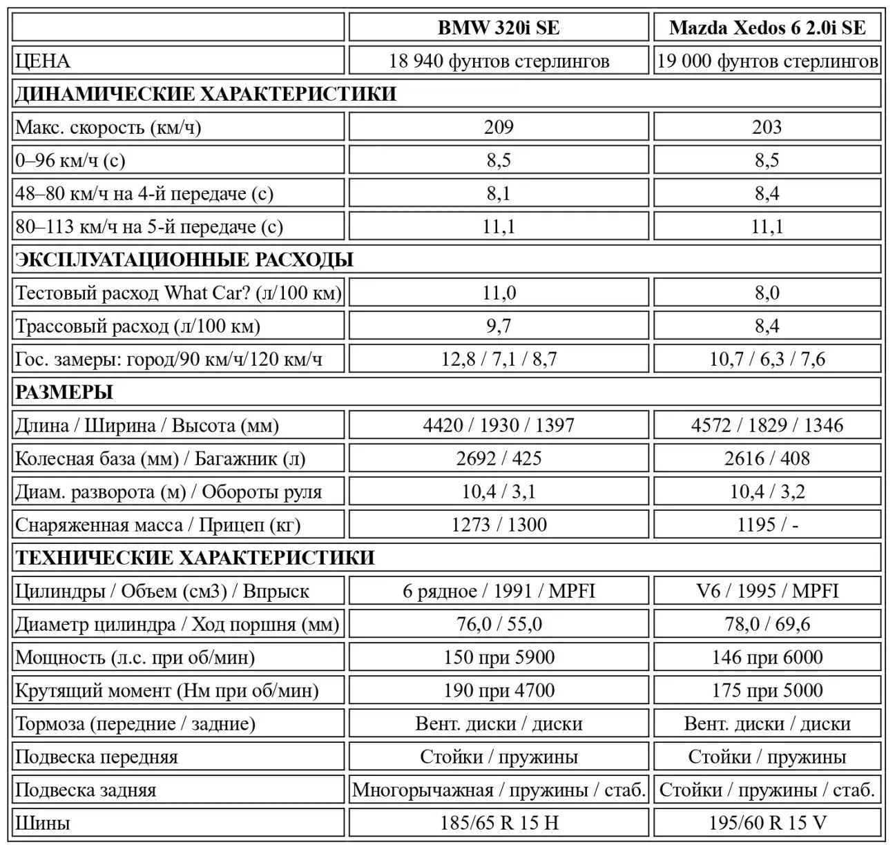 Перевод теста-сравнения Mazda Xedos 6 2.0 vs BMW E36 320i SE от британского автомобильного журнального издания What Car?, Июль, 1992.