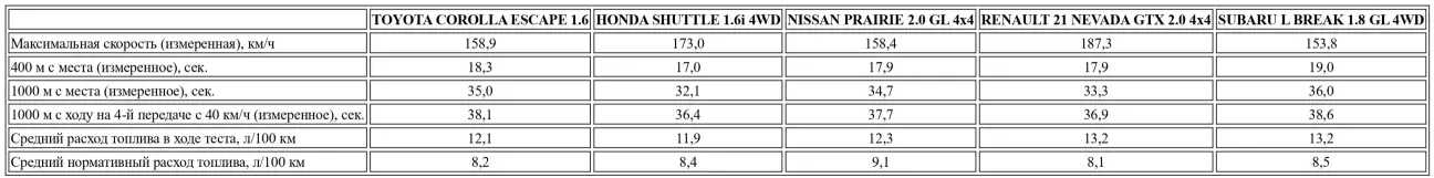 При объеме 1587 см³ мощность в 95 л.с. является хорошим показателем, так как удельная мощность двигателя 4A-F приближается к 60 л.с./л (точнее, 59,86 л.с./л). Максимальная мощность достигается при 6000 об/мин, что кажется высоковатым для агрегата, установленного на универсальный автомобиль! Крутящий момент в 135 Нм весьма солиден; он доступен при 3600 об/мин. Таким образом, диапазон оборотов, в котором двигатель наиболее эффективен, достаточно широк. Это впечатление доминирует на борту Escape. Эта Toyota не демонстрирует захватывающих ускорений, в чем ей, несомненно, помогает полный привод, улучшающий тягу и исключающий любую непреднамеренную пробуксовку. Тем не менее Escape «бежит» хорошо, часто заставляя забыть о лишнем весе, наложенном ведущим задним мостом. В наших руках она набрала 100 км/ч за 13,9 сек, преодолела дистанции 400 и 1000 м за 18,3 и 35,0 сек соответственно, что совсем неплохо. Ее максимальная скорость также вполне логична в контексте массы и технической начинки. Toyota заявляет максимальную скорость 170 км/ч, которую наш автомобиль так и не развил. Наши хронометры зафиксировали максимум 158,9 км/ч на четвертой передаче и 157,6 км/ч на пятой. Разница между официальными данными и нашими замерами слишком велика, чтобы казаться правдоподобной. И тем не менее…