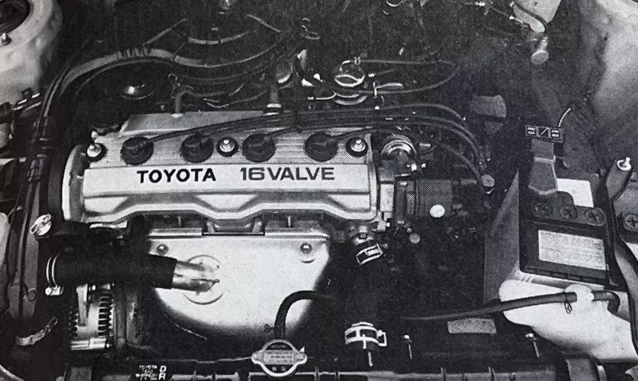 Двигатель, пожалуй, является наименее интересным механическим элементом всей конструкции. Он нам знаком, так как устанавливается на другие модели Toyota, и имеет классическую архитектуру: чугунный блок, головка из легкого сплава, коленвал на пяти опорах, два распредвала в головке (DOHC): первый (ближе к передней части) приводится зубчатым ремнем, второй — от первого через систему шестерен. Каждый цилиндр обслуживается четырьмя клапанами с прямым приводом (с регулировочными шайбами): два на впуск, два на выпуск.