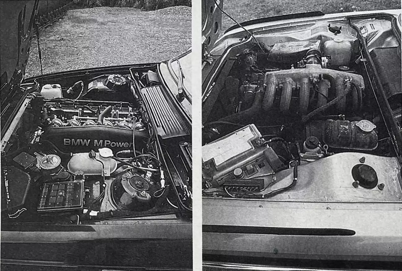 Двигатель M6 характеризуется прежде всего своей 24-клапанной головкой и продвинутым электронным управлением. На моторном стенде он выдает внушительные 286 л.с. при 6500 об/мин. Он должен был позволить машине буквально растоптать свою соперницу, не будь та столь легкой. Из-за этого «недостатка» удельные показатели мощности уравновешиваются, хотя преимущество, разумеется, остается на стороне новинки (мягко сказано. Если вернуться к цифрам, соотношение составляет 5,24 кг/л.с. для M6 и 5,66 кг/л.с. для CSL). В паре с мотором, естественно, идет пятиступенчатая коробка передач с классической схемой переключений. Самоблокирующийся дифференциал, само собой, прописался в заднем мосту. Сюрприз в плане... колесной базы: M6 действительно является младшей сестрой 3.0 CSL: рулетка подтверждает — 2,625 м и там, и там. Ничего из ряда вон выходящего в плане подвески или рулевого управления (с усилителем) не наблюдается, так что я не буду на этом задерживаться. Если тормоза выглядят вполне достойно на бумаге (четыре вентилируемых диска, наличие ABS), то при взгляде на размер суппортов закрадывается тень сомнения, особенно когда вспоминаешь об огромном табуне, который нужно обуздать, — табуне, тянущем за собой тяжелую поклажу! Неужели мы, как и в случае сравнения 2002 Turbo и M3, придем к тому, что почти пожалеем о предке?