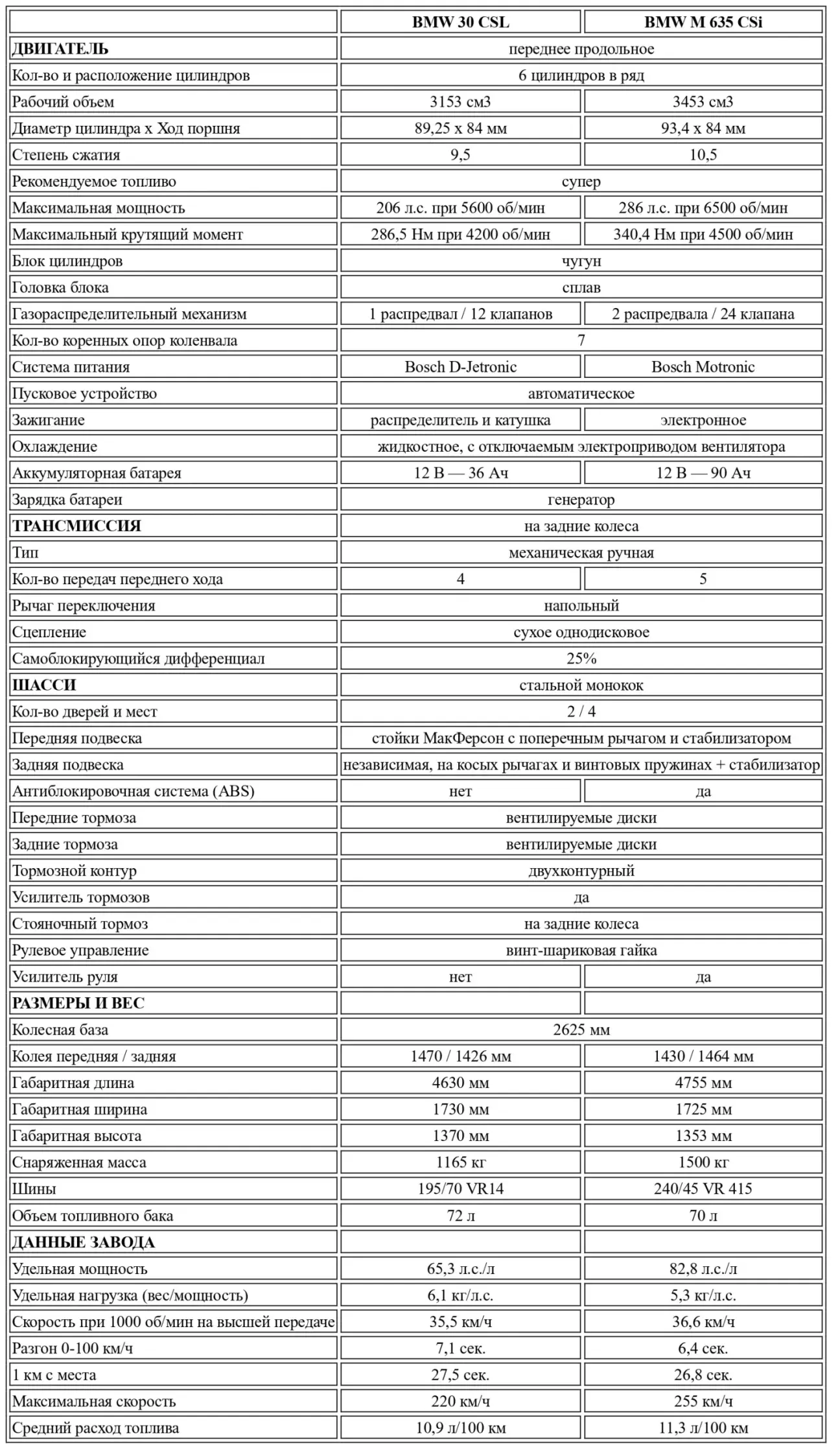 Если изучить показатели мощности, то можно заметить, что начав со 180 л.с., 3.0 CSL закончила свой путь на отметке в 206 л.с., пройдя через переходный этап в 200 сил. И если любой искушенный автомобилист помнит о 3.0 CS и CSi, то с CSL дело обстоит иначе. Помимо этой особенности, можно задаться вопросом: что заставило BMW создать вариант, в конечном счете столь мало отличающийся от двух других? Ответ умещается в одно слово: гонки. Иного оправдания не существует. Чтобы сделать свое большое купе более конкурентоспособным в Группе 2 (улучшенные серийные автомобили начала 70-х), BMW взялась за постройку как минимум 1000 единиц CSL — число, продиктованное омологационными требованиями. Конвейер остановился, когда свет увидели 1039 экземпляров (539 с левым рулем, остальные — с правым). По большому счету, 3.0 CSL представляла собой облегченную 3.0 CS или CSi, порой обвешанную набором аэродинамических аксессуаров, которые сегодня весьма своеобразно искажают чистые линии этого красивого приземистого купе. M635 CSI, в свою очередь, базируется на модели 635, появившейся в 1978 году (двумя годами ранее родились 630 и 633). Это 635-я, «заряженная» переработанным двигателем от M1. Проще говоря, 3,5-литровый агрегат, увенчанный великолепной 24-клапанной головкой блока.