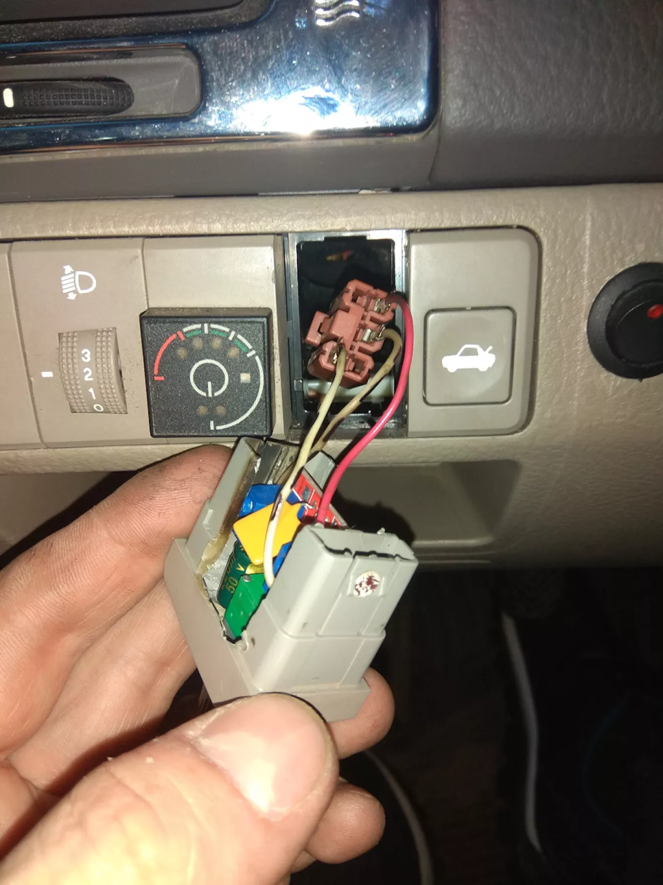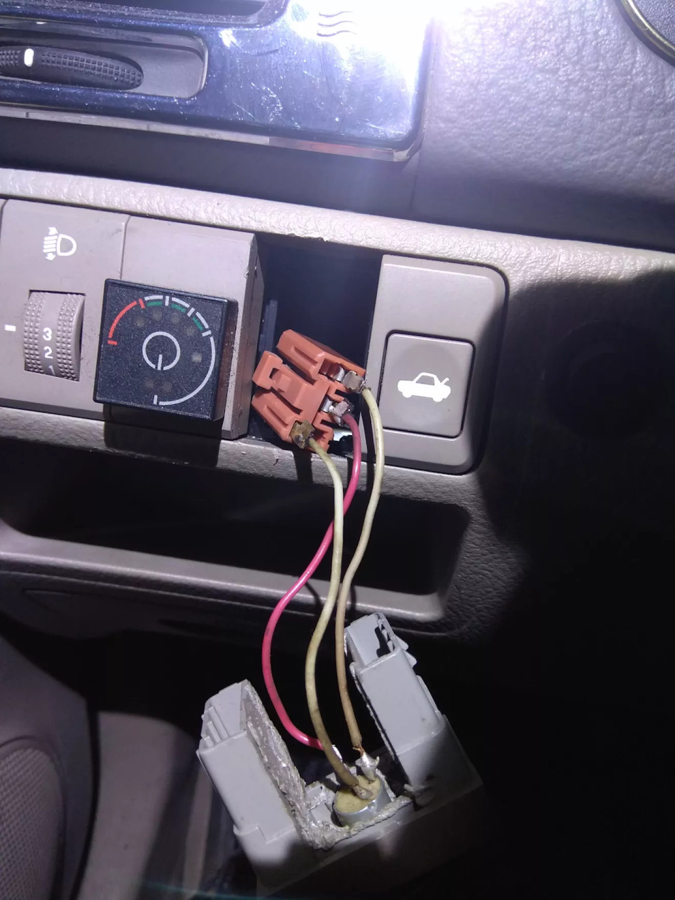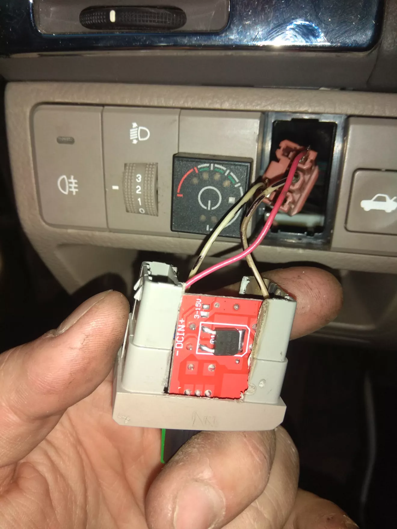 витягнув старий підстроювальний резистор (який поставив туди давно, але регулював він погано з морганням підсвітки) і замінив на цей дімер. Все працює чудово. Регулює дімер підсвітку і панелі приладів і усіх регуляторів кондиціонера та годинника плавно, від повного виключення до максимума. Рекомендую усім хто не хоче переплачувати за кнопку 15$. Вихід для підключення дімера там є. За допомогою мультиметра визначаєте де +/- і все. Єдине що від дімера підключаєте тільки один вихід — це мінус. І на вхід подаєте +/- 12В, які берете від клеми, яка є за заглушкою.