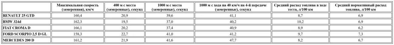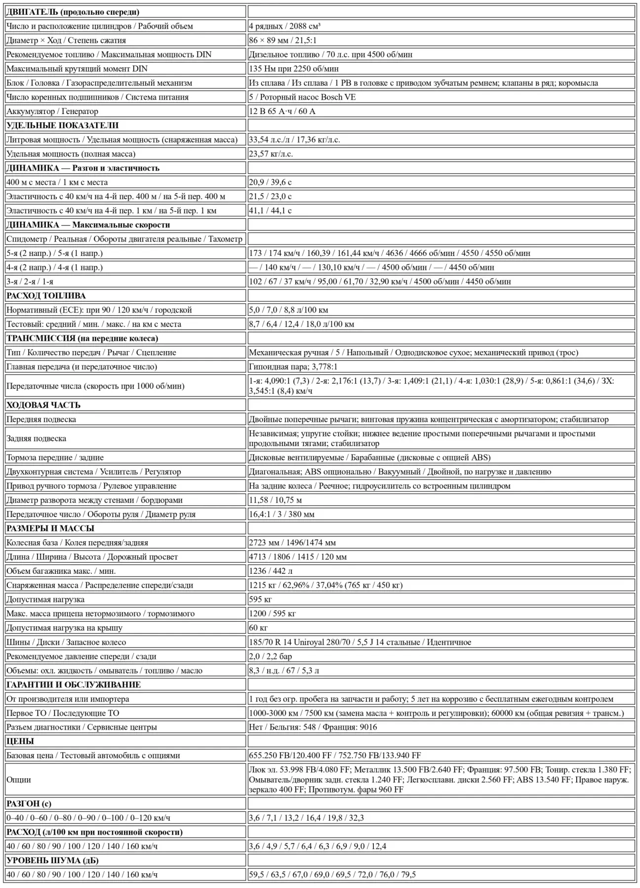 На бумаге, согласно данным Renault, изменения, внесенные в старый добрый атмосферный дизель объемом 2068 куб. см, заметно улучшают его показатели. Нам заявляют, что мощность выросла до 70 л.с., что доводит удельную мощность до 33,54 л.с./л. Наиболее благоприятный режим работы, опять же по данным Renault, находится в районе 4500 об/мин (стоит отметить, что тахометр напоминает: с 4300 об/мин начинается опасная зона!). Также по указаниям Renault, крутящий момент вырос до 135 Нм, что представляет собой прогресс в 8,5% при неизменных 2250 об/мин. Это хорошо... Да, но... Впечатления за рулем R 25 GTD — по крайней мере, за рулем того экземпляра, что был предоставлен нам бельгийским импортером и который, как мы полагаем, взят из партии для обычных клиентов — совсем иные! Разумеется, мы не ожидали найти здесь эластичность и динамизм турбодизеля 2.1, который творит чудеса в такой большой машине, как R 25 (1200 кг снаряженной массы).