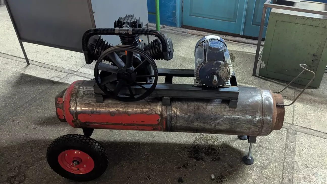 Врезультаті все поставив на основу, зробити прімітивну ручку з якогось прутка, ну і це вже почало виглядати як компресор. Важкий, солідний компресор.