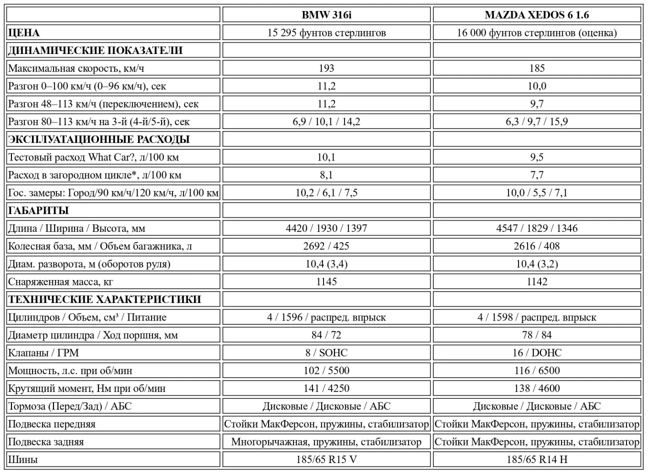 Mazda — очень убедительный автомобиль сам по себе. Она быстрее, чем BMW, экономичнее, лучше оснащена и выглядит более индивидуально в мире, где количество BMW 3-й серии растет с каждым днем. Xedos симпатична, азартна в управлении и необычна. Борьба была плотной, но мы считаем, что этот новичок лучше, чем BMW. Добавьте сюда превосходную остаточную стоимость Mazda, щедрую трехлетнюю гарантию (у BMW всего один год) и покладистый характер в плотном городском потоке, и станет ясно, почему расчетливому покупателю стоит выбрать именно Mazda.