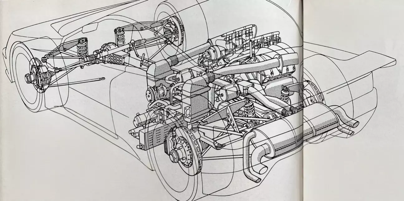 Агрегат сопряжен с 6-ступенчатой коробкой передач от Turbo 16 через двухдисковое сцепление гоночного типа. Эта коробка имеет как минимум две особенности: как и задний редуктор с центральным дифференциалом, она имеет принудительное масляное охлаждение. Для этого коленчатым валом приводятся в действие два масляных насоса, с которыми он соединен через полый первичный вал. Последний (и это наша вторая особенность) приводит в действие компрессор кондиционера, которому не нашлось места рядом с двигателем. При переключении передач датчик на педали сцепления командует кратковременным отсоединением компрессора, чтобы не нарушать синхронизацию коробки. Далее, как и на Turbo 16, крутящий момент распределяется в пропорции 25% на переднюю ось и 75% на заднюю благодаря межосевому дифференциалу с планетарной передачей. Он работает в паре с вискомуфтой типа Ferguson для ограничения возможных пробуксовок. Момент передается на передний редуктор стальным трубчатым валом, вращающимся внутри углепластиковой трубы, которая служит для придания жесткости всей конструкции. Опять же, как на T16. Дифференциалы здесь новые, но о них мы поговорим в следующей главе.
