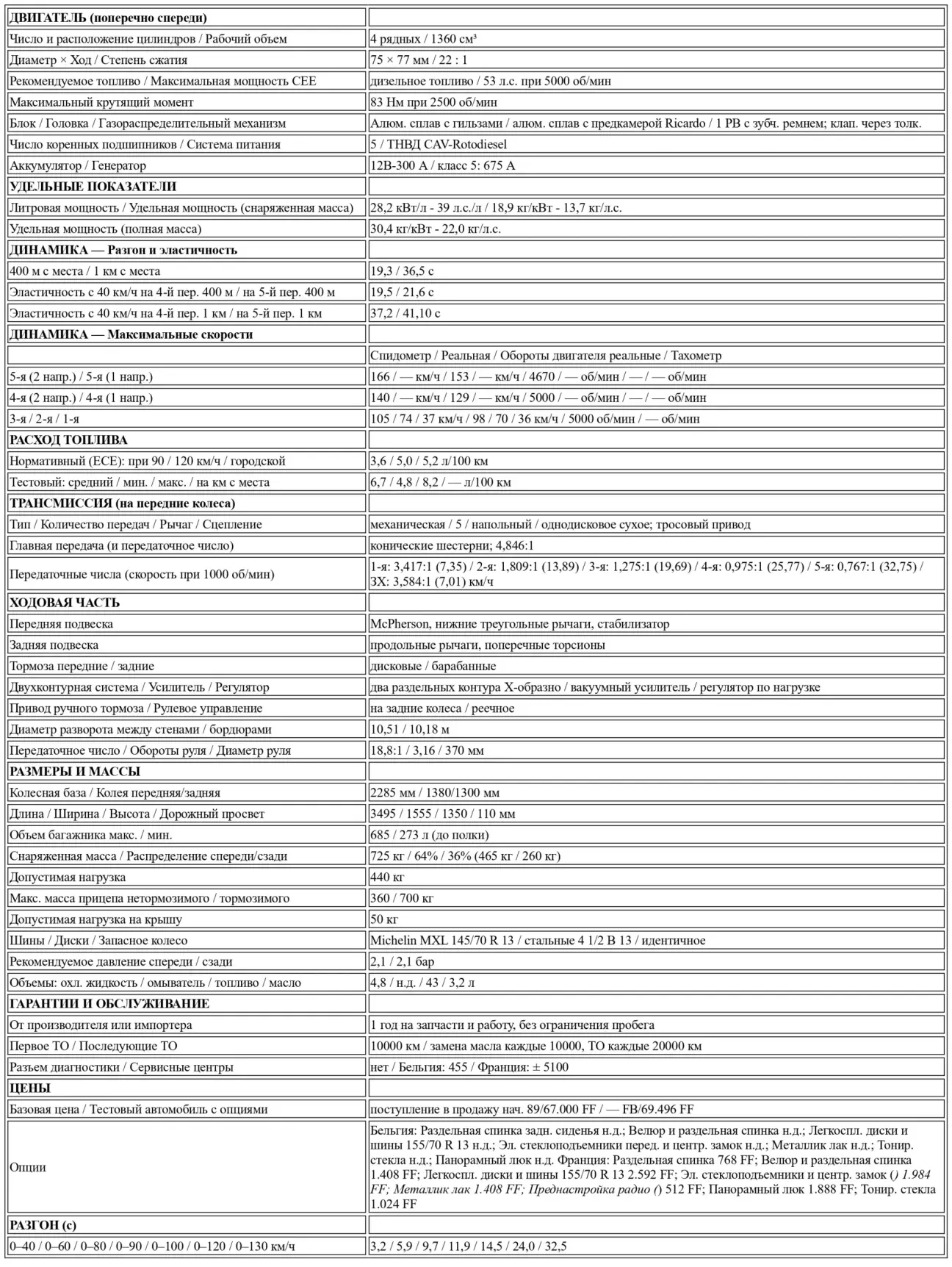 Решительно современный, малый 1400 Diesel мнит себя бензиновым мотором и заезжает на сервис лишь раз в 10 000 километров для замены масла. Можно также добавить, что регулировка клапанов рассчитана на весь срок службы, а трансмиссия также смазана раз и навсегда. Ничего особенного по части гарантий: один год на запчасти и работу без ограничения пробега; антикоррозийная защита существует и во Франции, и в Бельгии, но с несколько разными регламентами.