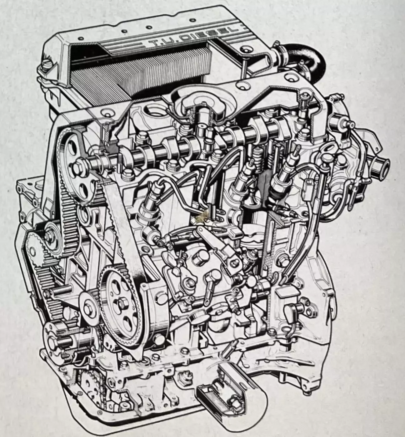 Этот четырехцилиндровый агрегат состоит из легкосплавной головки с камерами сгорания типа «Ricardo» и верхним распределительным валом, а также алюминиевого блока с гильзами. Гильзы чугунные, их конструкция была предметом особого внимания при проектировании в системах САПР, дабы обеспечить их наилучшее соседство с алюминием блока и избежать неприятностей, известных по печальной памяти Peugeot 204 Diesel. Хотя многие детали идентичны бензиновому мотору (коленвал, поддон картера, вкладыши или масляный насос), модификаций и оригинальных частей, конечно, много. Так, поршни и прокладка головки блока выполнены с запасом прочности и характеристиками, которые ранее резервировались для двигателей с наддувом; маховик облегченного типа снабжен демпфером крутильных колебаний. Впрыск осуществляется классическим роторным насосом, в контур включен подогрев топлива, чтобы предотвратить нелепые, но частые зимние поломки, а впускному тракту уделили особое внимание, что позволило мотору быть довольно тихим. Система предпускового подогрева не имеет особенностей — она достаточно быстрая, хотя и не достигает показателей новейших систем с электронным управлением.