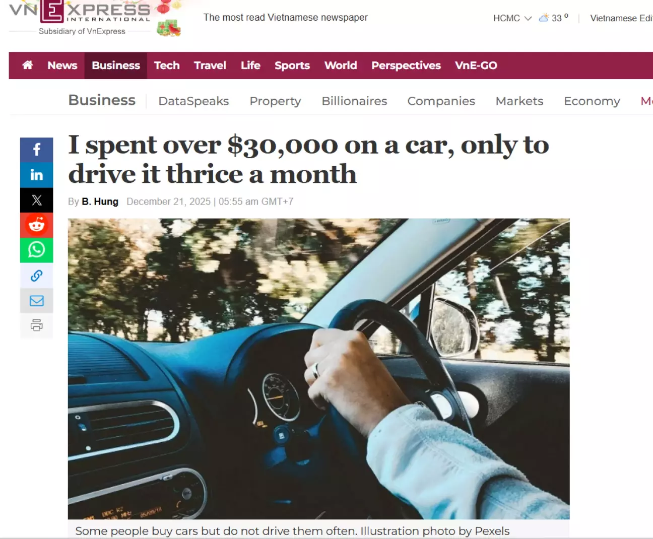 Я купив свою першу машину майже за 800 мільйонів донгів (приблизно 30 400 доларів США), коли мені було 30 років. У день отримання я був переповнений радістю — нарешті я володію «великим активом». Я думав, що дорога на роботу стане простішою, сім’я почне частіше подорожувати, а життя стане комфортнішим.