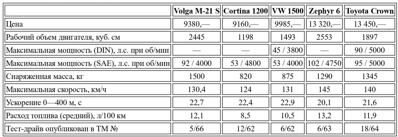 Если оценивать Volga первым способом, ее можно сравнить с западными автомобилями, обладающими схожими динамическими характеристиками, вместимостью или принадлежащими к тому же размерному классу. Скорость порядка 135 км/ч среди западных машин развивают, в частности, Zephyr 4, Hillman Minx, Neckar 1200 и Peugeot 403. За исключением Zephyr, все они являются максимум 5-местными, а Zephyr, в свою очередь, почти на 40 % дороже. 6-местных машин можно найти сколько угодно, наиболее доступные из них — Zephyr 4, Opel Rekord Caravan и Toyota Crown Sedan. Самый дешевый из них — Caravan — почти на 30 % дороже Volga, к тому же это универсал. Если же сравнивать автомобили по рабочему объему двигателя, то в качестве оппонентов выступят Fiat 2300 Lusso, Ford Zephyr 6, Jaguar 2,4 l и Mercedes-Benz 250 S. Самый дешевый и медленный из них — Zephyr 6, который примерно на 60 % дороже Volga и всего на 15 км/ч (11 %) быстрее. Таким образом, сравнение с западными аналогами можно резюмировать утверждением, что Volga заметно медленнее конкурентов как в своем литраже, так и в своем классе. Вне всяких сомнений, она также менее комфортабельна и во многих аспектах более старомодна, чем современные западные автомобили. Но после того же самого сравнения можно с таким же успехом заявить, что Volga как утилитарный автомобиль выгоднее любого сопоставимого западного образца. При сравнении с западными машинами той же цены ее вместимость оказывается непревзойденной, а по сравнению с равными по размеру ее цена настолько ниже, что за период амортизации она «стерпит» даже значительно более высокие расходы на ремонт и топливо. Кроме того, в контексте ценового сравнения совершенно неразумно утверждать, что цена Volga занижена «искусственно», так как покупателя едва ли волнует механизм ценообразования — для него главное, сколько денег автомобиль заберет из его кошелька.