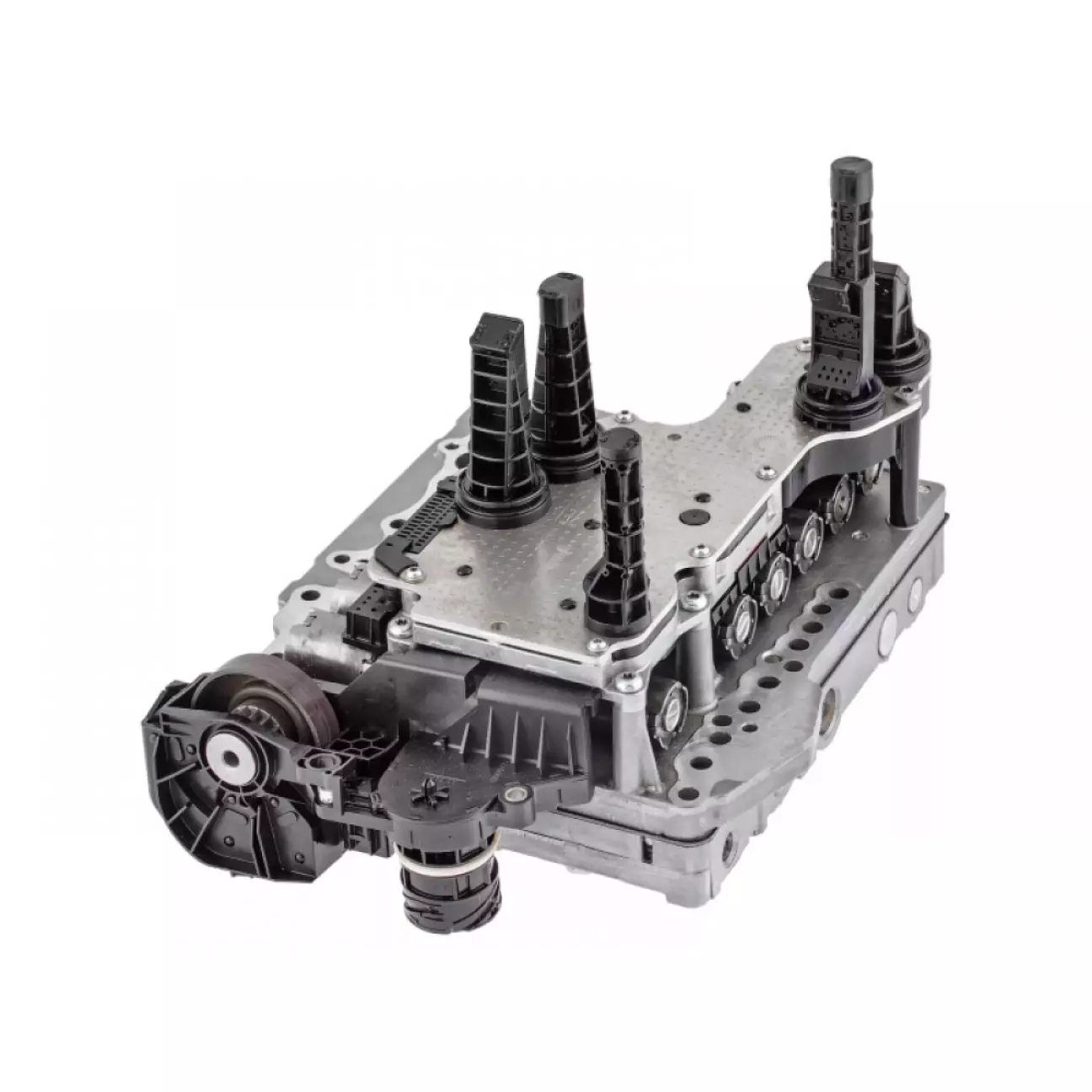 Гідравлічна плита (Valve Body): Прецизійна алюмінієва основа з лабіринтом каналів. Вона виконує роль розподільчого колектора, що спрямовує потоки масла до поршнів зчеплення та вилок перемикання.