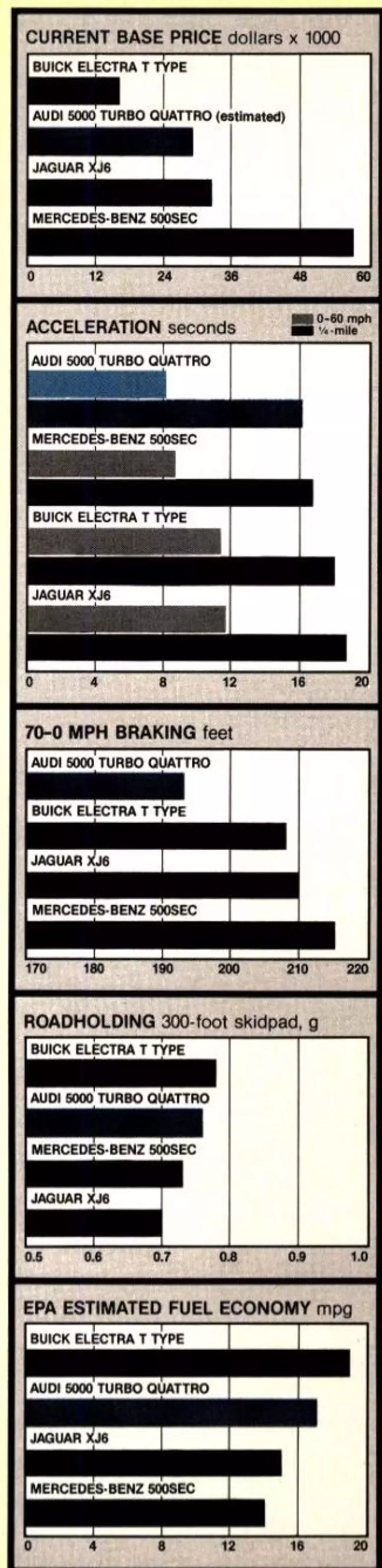 Я начинаю понимать. Несмотря на всё, что говорили нам «Ферди» Пиех и инженерный отдел Audi, я не видел причин делать полноприводным каждый автомобиль. Хорошо проработанные передне- и заднеприводные машины вполне справляются. Существующие переднеприводные Audi могли управляться и «чувствоваться» лучше, чем ранние полноприводные машины компании. Но затем я заполучил нынешнее купе Quattro Turbo и прохватил от Санта-Барбары до Монтерея и обратно по Первому шоссе великолепным днем. Я был ошеломлен способностью машины превращать малое время в огромное расстояние (и в огромное удовольствие). Теперь я вдохнул воздух Мичигана в текучей 5000 Turbo Quattro. Она едет лучше, чем переднеприводная 5000 Turbo, тихая, как катакомбы, и у нее «ноги» как у «Мисс Калифорния». Она делает практически всё правильно, хотя мне хотелось бы, чтобы она была такой же монолитной, как большой Mercedes. Для коротких поездок по повседневным делам я бы все же предпочел обычную 5000S с беспроблемным «автоматом», но я возьму купе Quattro Turbo для «отжига» и 5000 Turbo Quattro для трансконтинентальных перелетов. Ферди и ребята явно нащупали что-то важное. — Ларри Гриффин