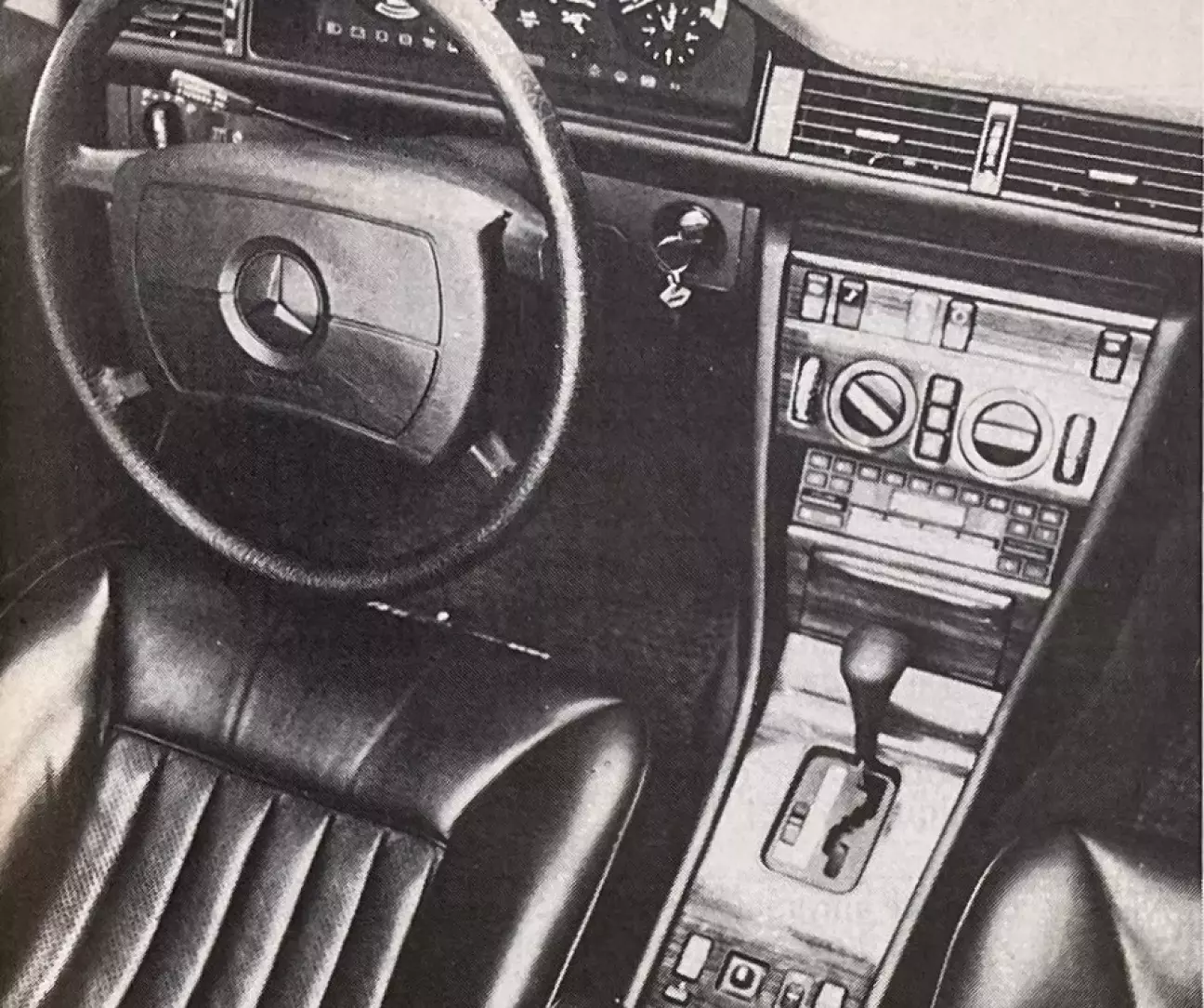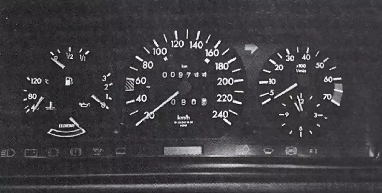 200 или 300E — никакой разницы! Или почти никакой. Та же идеально читаемая приборная панель со спидометром, тахометром, термометром охлаждающей жидкости, манометром масла, указателем уровня топлива, эконометром, где игла движется из черной зоны в красную, и аналоговыми часами. Линейка контрольных ламп завершает ансамбль. Не хватает индикаторов включения обогрева заднего стекла и заднего противотуманного фонаря — они расположены в самих кнопках управления, вне поля зрения водителя. Внешний термометр с цифровым дисплеем дополняет картину, но предлагается лишь как опция. Забавно и практично зимой, когда есть риск гололеда. Органы управления традиционны для Mercedes, к тому же они действительно практичны.