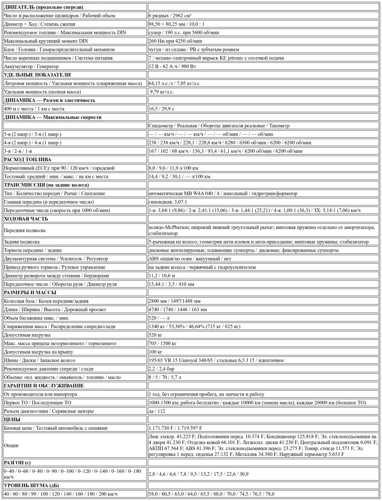 Этот тест ожидался с нетерпением. Шильдик «300 E» действительно обладает некоей магией… Увы, великолепной динамики не случилось из-за слишком высоких рабочих оборотов, но эффективная максимальная скорость (228 км/ч) достигнута благодаря отличной аэродинамике. Ускорения не слишком поощряются автоматической трансмиссией, а грузное и вальяжное поведение скорее склоняет к спокойной, размеренной и плавной езде. Итог более примечателен в плане расхода топлива, несмотря на «автомат». Последний по-прежнему приятен, удачно настроен и незаметен. Возможность выбора между экономичным и спортивным режимами — это роскошь, которой пользуешься лишь в экстремальных условиях, когда есть твердое намерение продавить педаль газа. Mercedes 300E, как и 230-ый, который мы тестировали несколько месяцев назад, — это прежде всего эффективный и комфортабельный «пожиратель миль» с великолепной шумоизоляцией. Что касается его цены, то она кусается и отягощена слишком длинным списком весьма дорогостоящих опций…