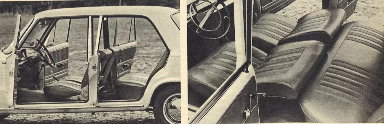 Кузов вырос главным образом в ширину: дополнительные 10 см колеи значат очень много. 1100 всегда казался немного узким и оттого «малолитражным». У 124 пропорции снаружи приятнее, а внутри — просторнее. Прибавка колесной базы в 6 см ощущается не так сильно: запас для коленей сзади невелик, как и у всех машин с базой менее 2,50 м. Если сидящие впереди потеснятся и сдвинут кресла вперед, взрослые пассажиры смогут разместить сзади ноги; при полностью отодвинутых назад сиденьях места хватит только детям. Однако для водителей среднего роста посадка за рулем хороша, даже если не отодвигаться до упора. Размещение четырех или тем более пяти крупных взрослых требует компромисса. Заслуживает внимания глубина подушек сидений, составляющая более 50 см спереди и сзади.