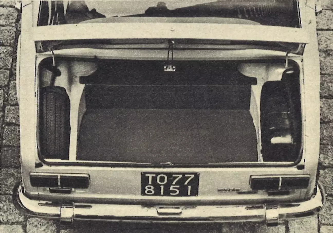 Сзади вертикально установлены бензобак (справа) и запасное колесо (слева). В результате получается хоть и не широкий, но очень высокий багажник, объема которого в редких случаях может не хватить. По нашему «футбольному» замеру, с результатом в 70 мячей он оказался лишь на 8 мячей меньше багажника Opel Kadett и на 18 мячей больше, чем у VW 1600 TL. Бак вмещает 39 литров и пустеет не так быстро, как заставляет думать указатель топлива. Его резьбовая крышка оказалась непрактичной: заправщики часто накручивали ее криво, из-за чего бензин вытекал. Соединение горловины с баком эластичное — при авариях это должно позволять баку смещаться без утечки топлива. Спереди и сзади предусмотрены буксировочные проушины, но они, как и у большинства машин, слишком малы для крюков стандартных буксировочных тросов.
