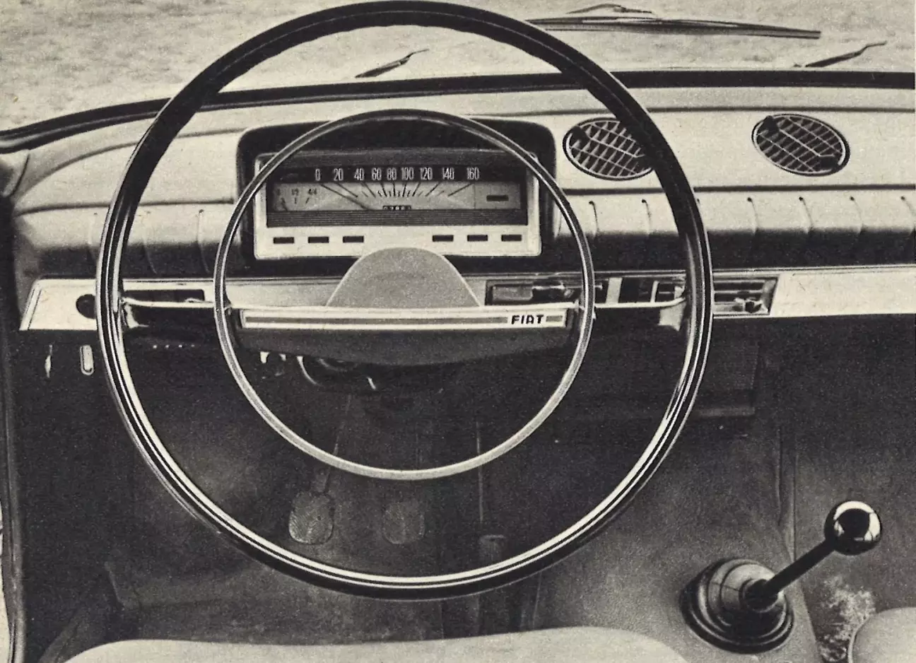 Оснащение показывает, как тщательно Fiat соблюдает классовую иерархию: оно не столь аскетично, как у младших моделей, но и не столь богато, как у 1500 или старших типов. Помимо спидометра с его растянутой шкалой, которую не очень удобно читать, есть лишь один стрелочный прибор — указатель уровня топлива. Он, как всегда у Fiat, показывает очень «осторожно», в чем ему помогает контрольная лампа. Также имеются лампы температуры воды, давления масла, генератора и — по итальянской моде — включенного света, плюс, разумеется, указатели поворотов и дальний свет. Для ручного тормоза лампы нет, что не столь критично, так как рычаг расположен между сиденьями, где его трудно забыть. Три тумблера света, подсветки приборов и стеклоочистителя, а также резиновая кнопка омывателя дополняют лаконичную и наглядную переднюю панель. Ниже расположена рукоятка пускового устройства карбюратора — возможно, со временем от него откажутся, поэтому его разместили отдельно. Крышка весьма вместительного перчаточного ящика для разнообразия открывается вверх; водителю до нее тянуться неудобно, а других мест для мелочей, к сожалению, нет. Переключение света осуществляется рычагом на рулевой колонке; немецкая версия должна получить также функцию мигания дальним светом.