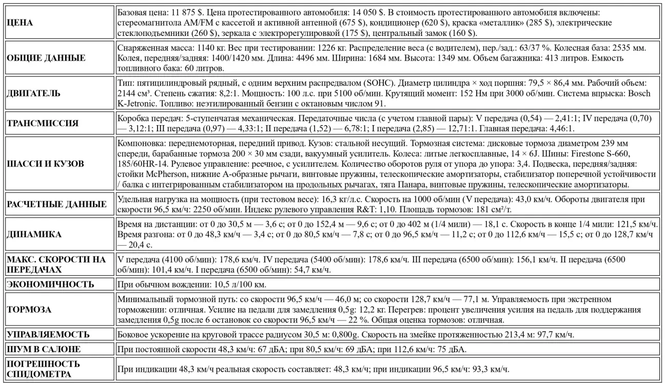 Поведение Coupe при экстренном торможении было охарактеризовано тест-пилотом как отличное. Тормоза обладают завидным балансом между передней и задней осями и при поддержке цепких радиальных шин Firestone S-660 размерности 185/60HR-14 со стальным кордом обеспечивают короткий тормозной путь: 46 метров со скорости 96,5 км/ч и 77 метров со скорости 128,7 км/ч при имитации панической остановки. Мы и раньше отмечали «ватность» педали тормоза у Audi, и Coupe не стала исключением, однако на эффективности замедления это явно не сказывается.