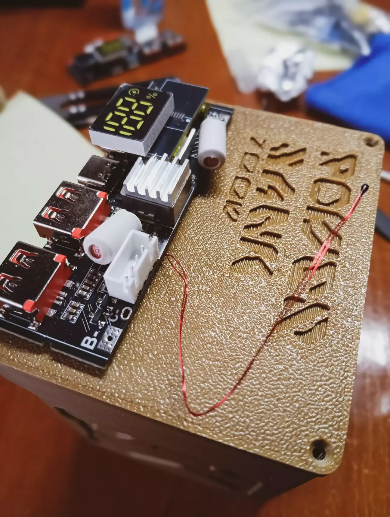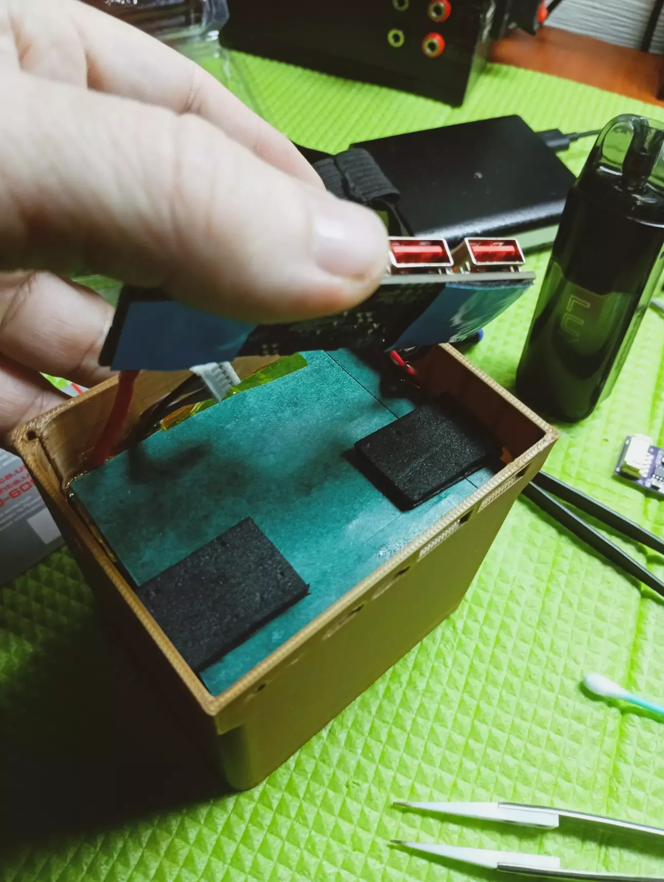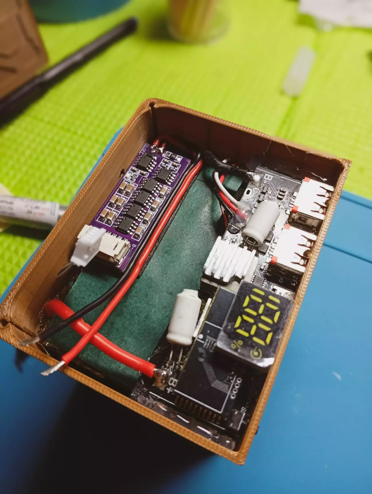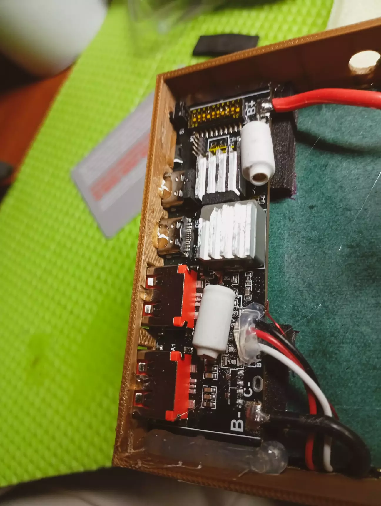 На платі павербанку, прийшлося випаяти фішку монітора, так як не влазить в корпус, дроти з неї впираються в кришку