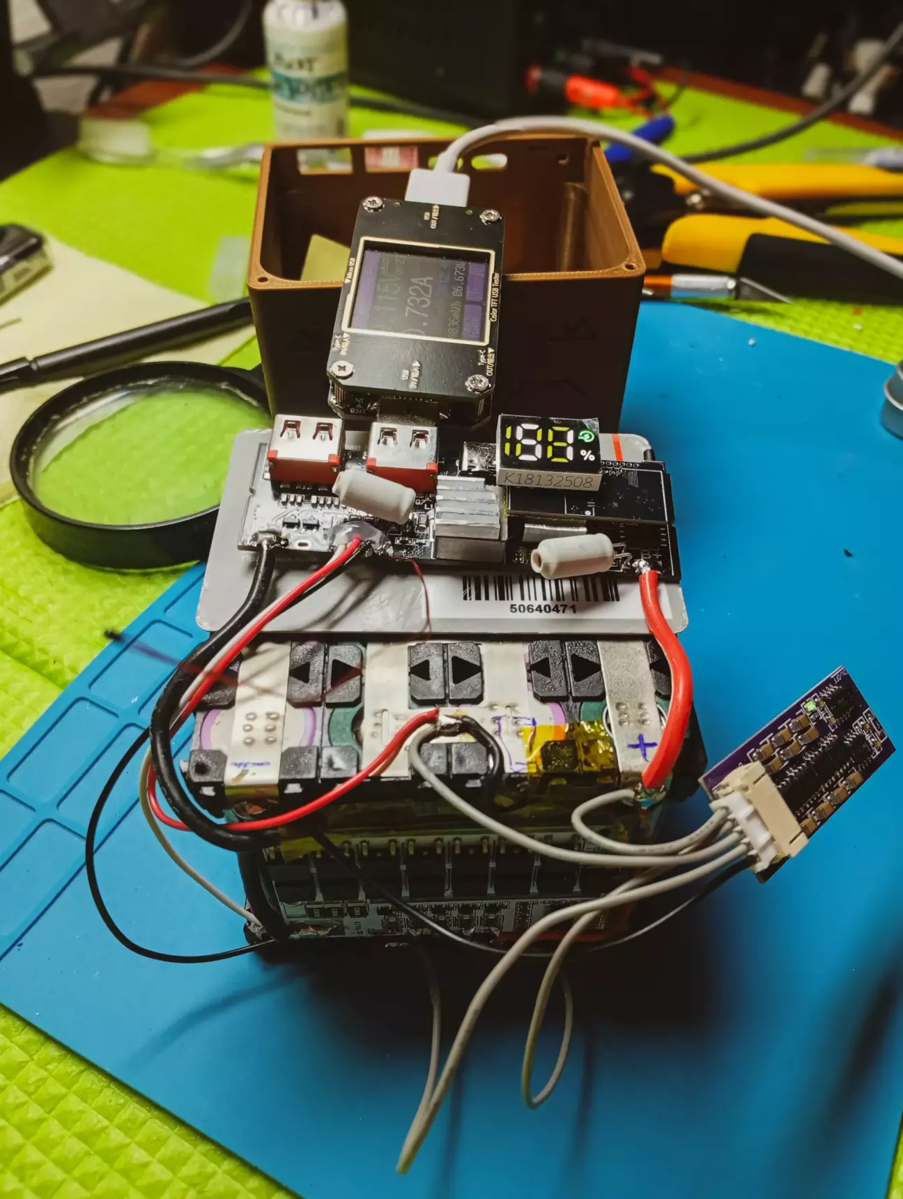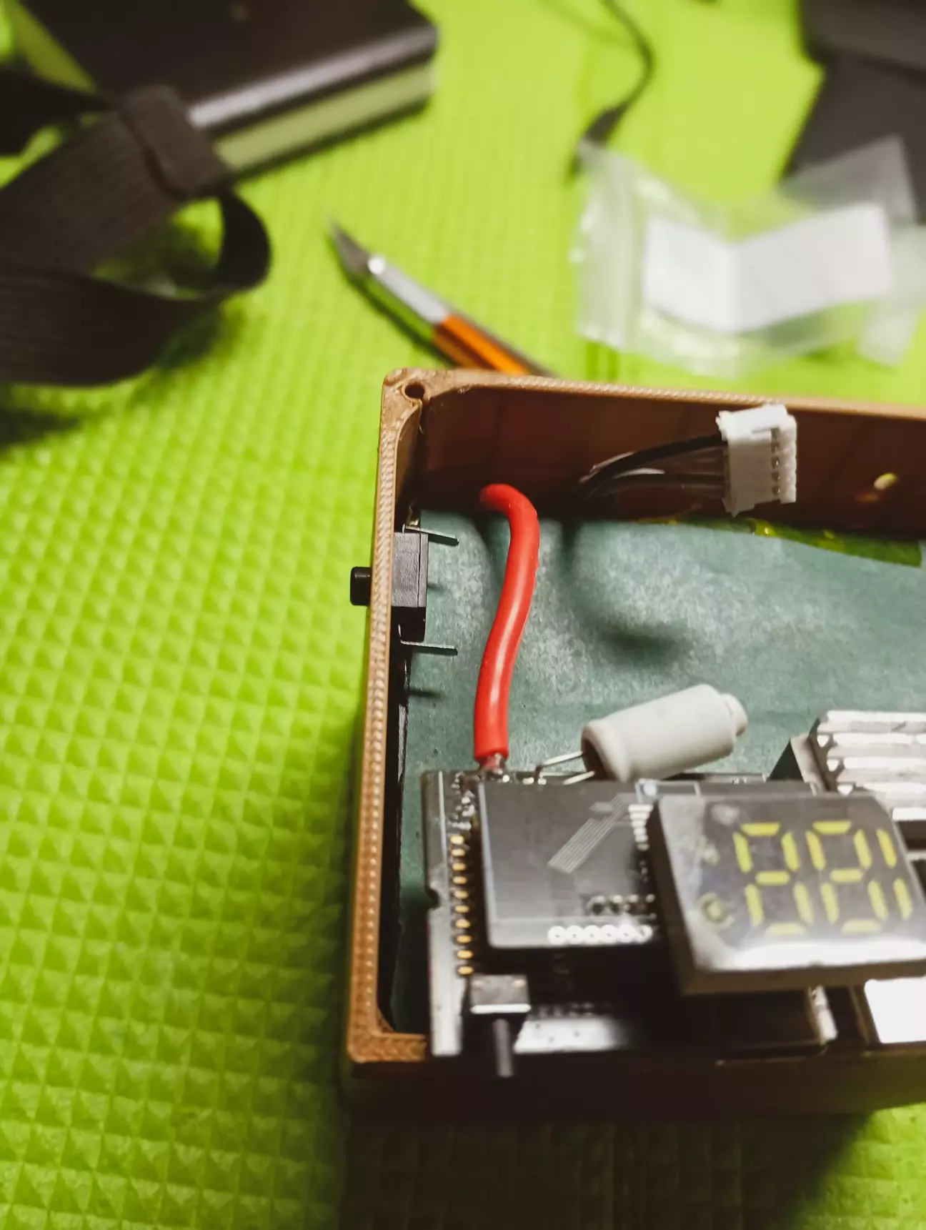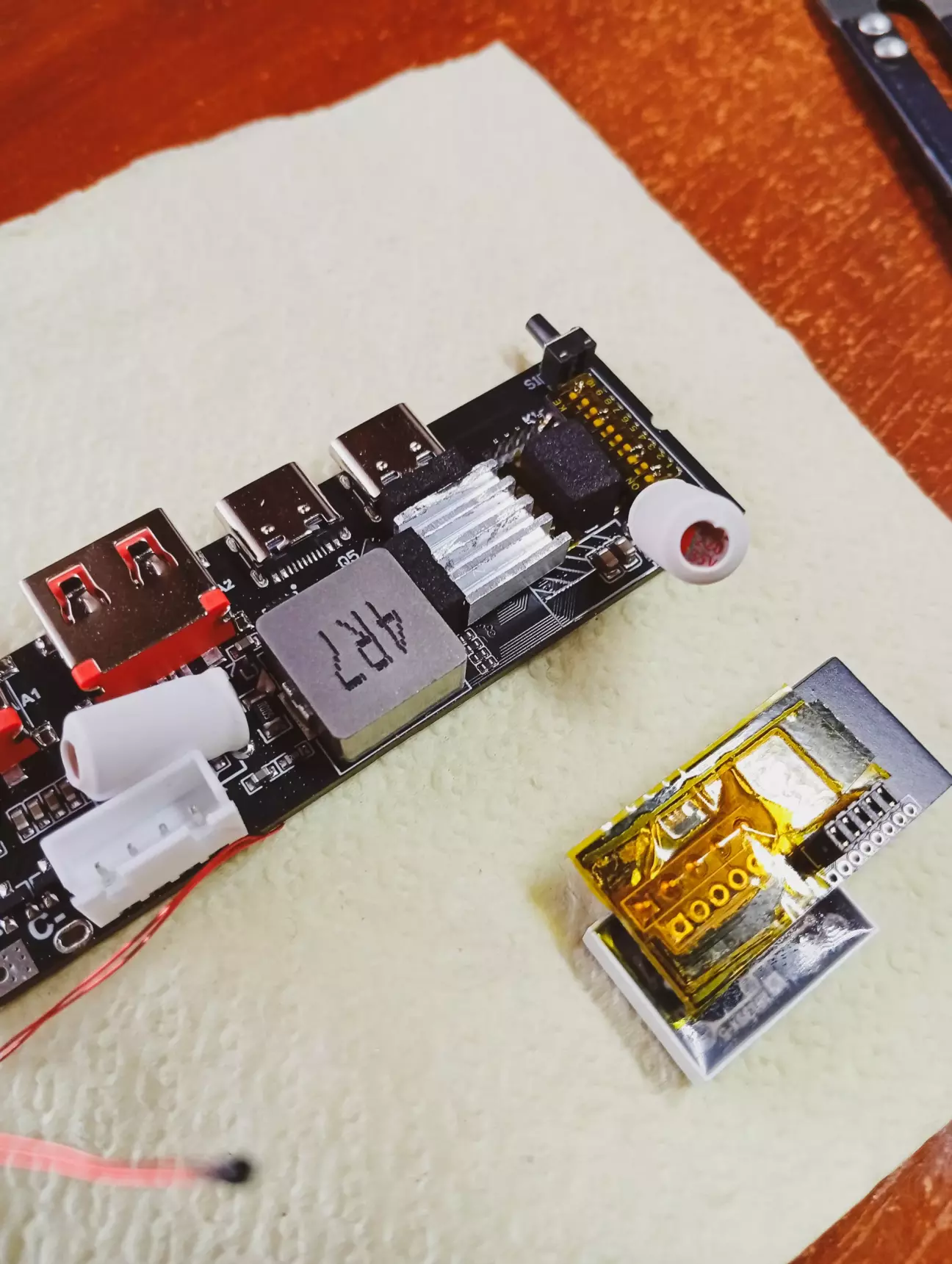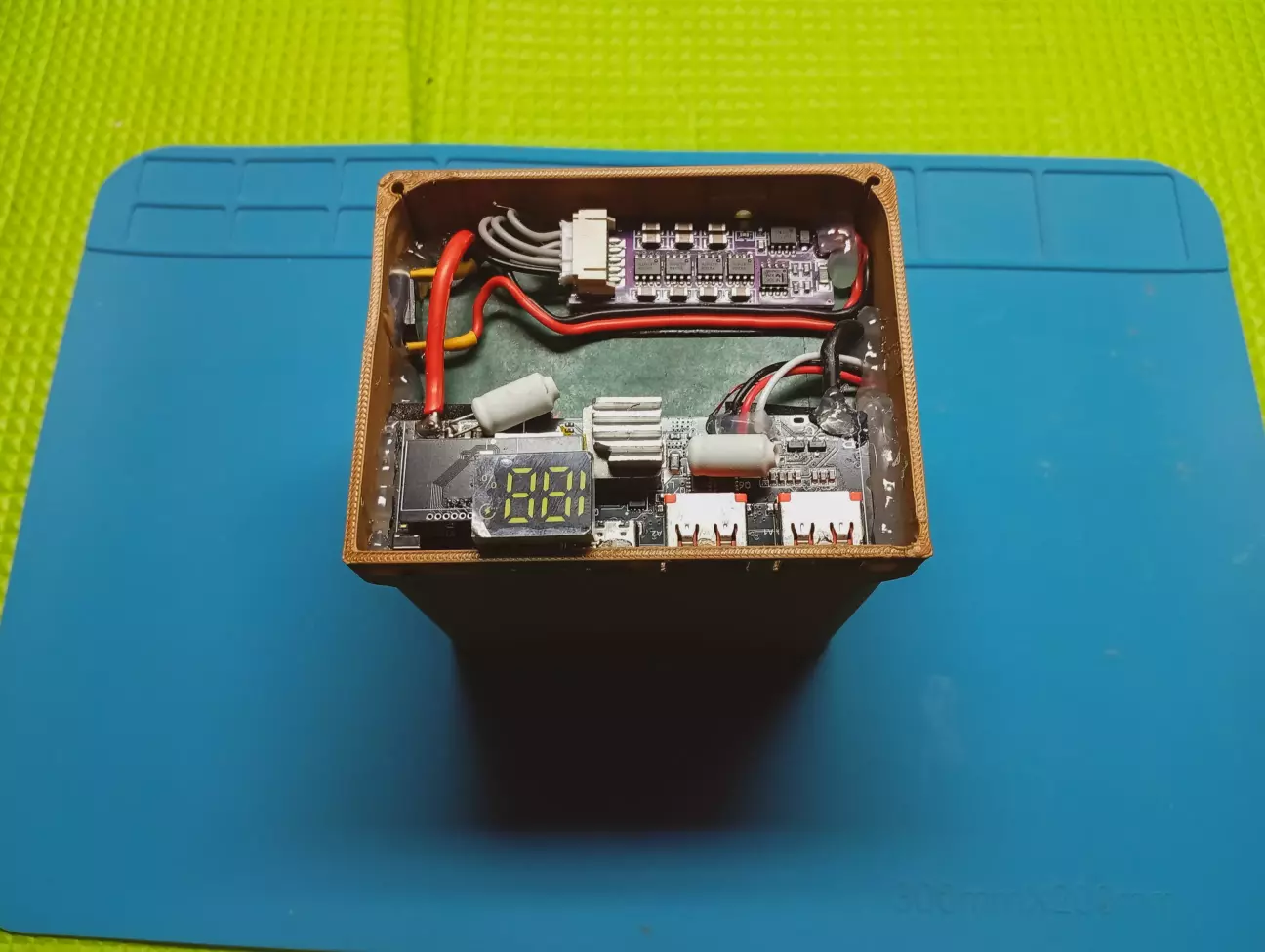 На платі павербанку, прийшлося випаяти фішку монітора, так як не влазить в корпус, дроти з неї впираються в кришку