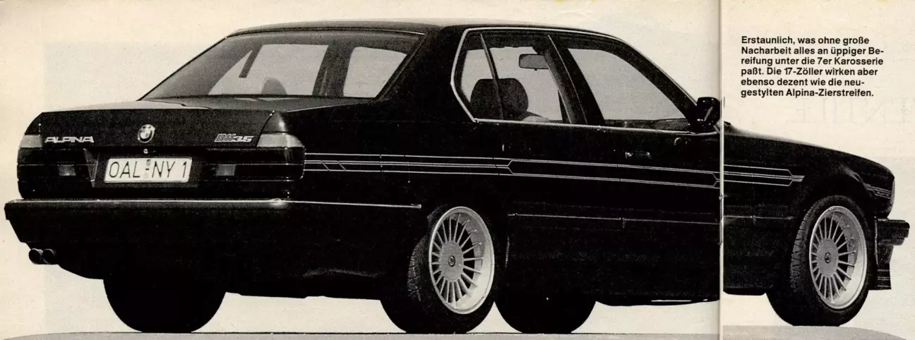 Вне всякого сомнения, B 11 обладает всеми данными, чтобы стать самым спортивным люкс-седаном. Выпускать поводья этих 250 «лошадок» — сплошное удовольствие. И всё же благодаря гармоничной настройке двигателя и ходовой части на ней так же легко перейти на мягкую рысь. В остальном справедливо следующее: если вы довольны характером движения своего «рысака» 730/735i, но желаете выглядеть как «скакун» от Alpina, в Бухлоэ вам помогут. Почти за 7000 марок можно приобрести комплект 17-дюймовых колес и декоративные полосы.