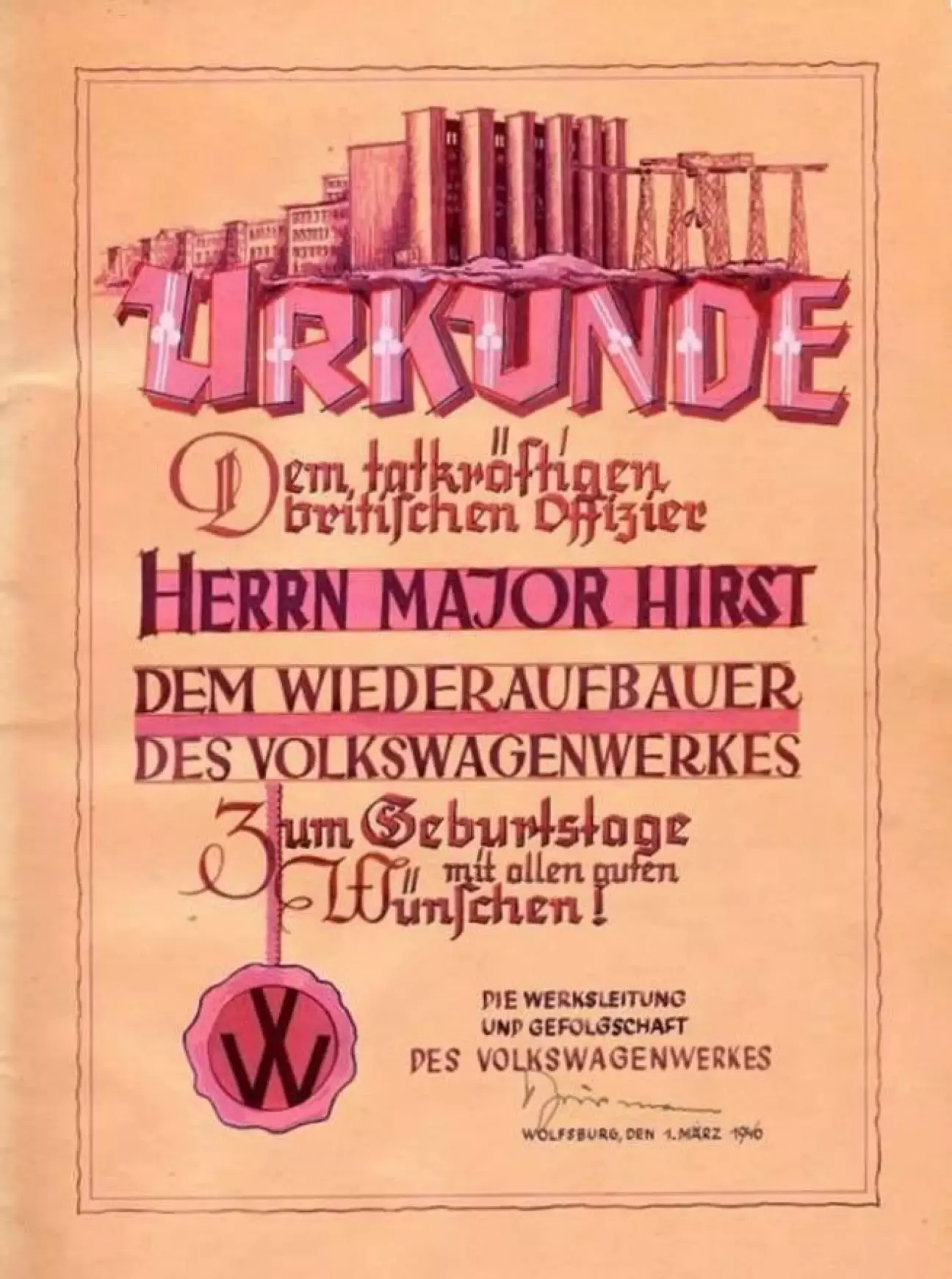 Енергійному британському офіцерові, пану майору Герсту, відновлювачу Volkswagenwerk, з нагоди дня народження — з найкращими побажаннями!