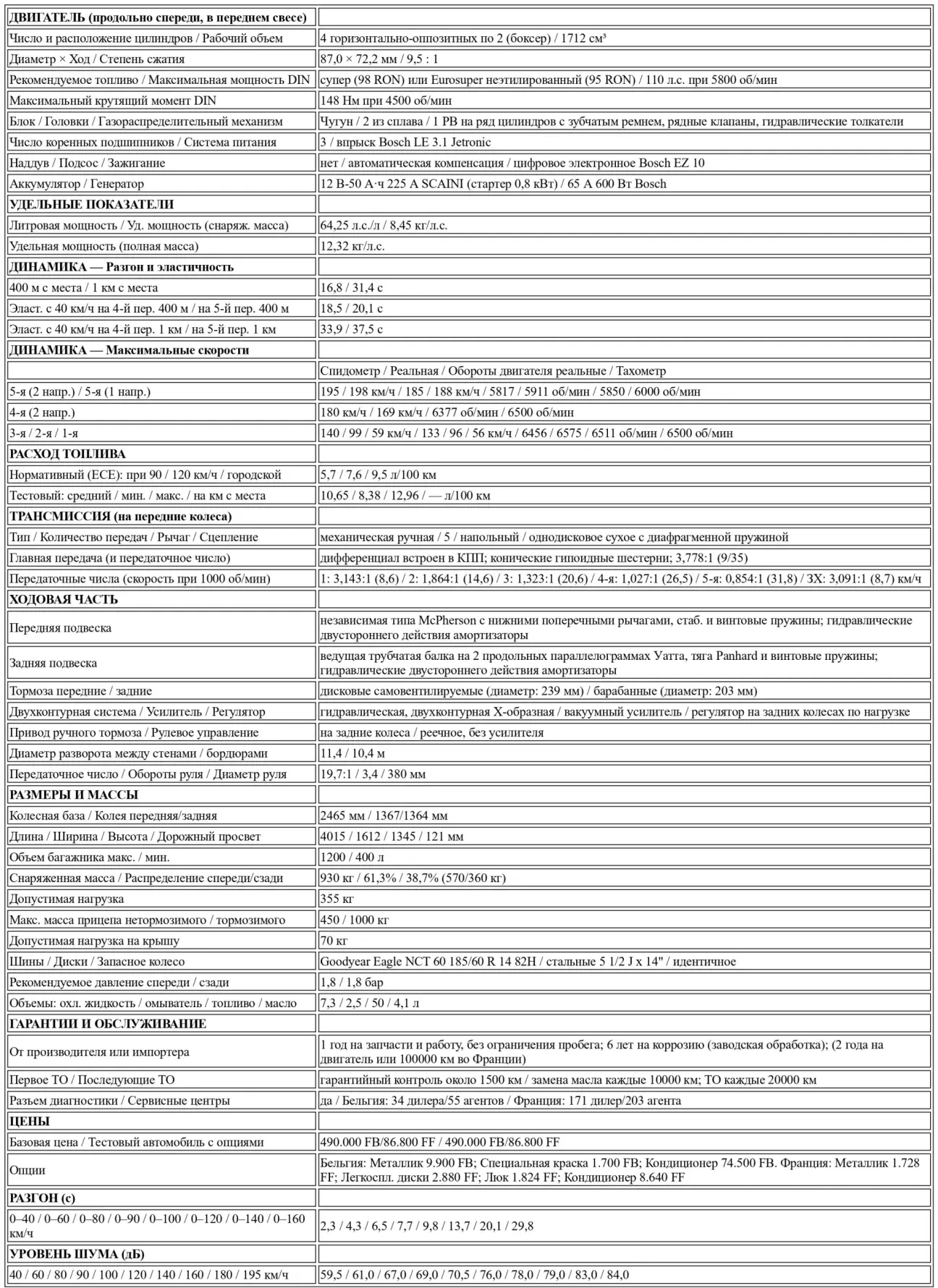 Как только эти несколько правил приличия усвоены, она становится соучастницей и вернет вам все удовольствие, которое вы ей доставили, сторицей. Её курсовая устойчивость оказывается надежной на прямой, даже при полном газе под боковым ветром (свыше 150 км/ч: аэродинамические шумы и отрыв щеток стеклоочистителя). На криволинейных траекториях она остается преданной до тех пор, пока вы стараетесь дозировать крутящий момент, передаваемый на передние колеса. Излишества или ошибки в оценке быстро сопровождаются потерей тяги и реакциями на руле, порой резкими. Феномен усиливается на влажном покрытии, но остается постоянно предсказуемым. 14-дюймовые шины (в данном случае Goodyear NCT 185/60) здесь ни при чем — скорее, дело в поведении передней оси, которая не всегда корректно переваривает сильные толчки ньютон-метров. Например, когда вы слишком сильно выкручиваете короткую передачу. Она гораздо чище проходит виражи на более высокой передаче, в плавном порыве, который не обязательно будет медленнее. При управлении с подобающей ей мерой I.E. проявляет себя уверенно и эффективно. Не забываем и о «задоре» оппозитника на низких оборотах, обеспечивающем отличную приемистость (всегда более 140 Нм между 3500 и 5500 об/мин в этой категории литража — это все же кое-что значит!).