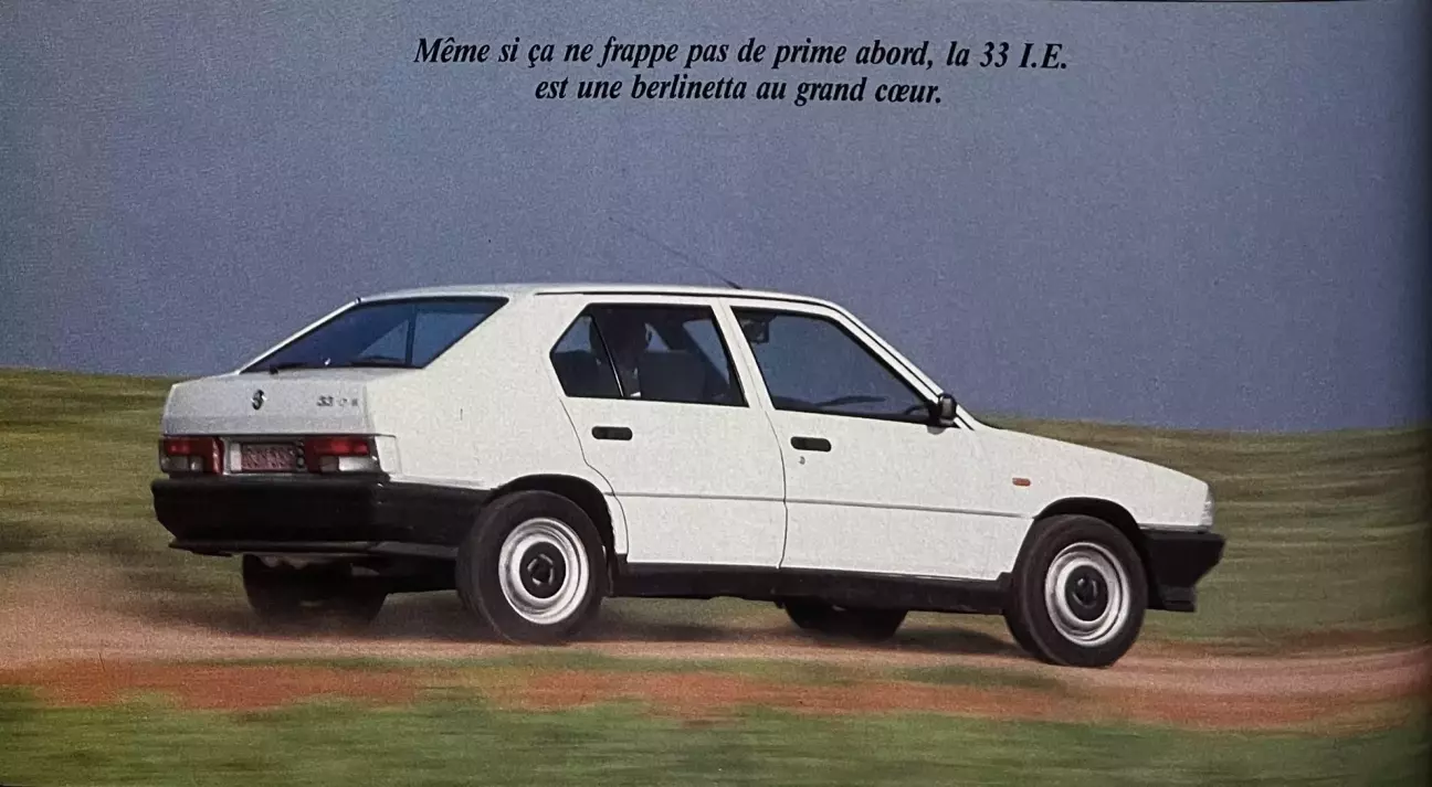 То, что I.E. отреклась от своих карбюраторных батарей, не делает её внезапно автомобилем-завоевателем. Целевая аудитория остается прежней. Кто это? Наблюдая вокруг за личностями за рулем 33-х в потоке, даже не проводя социологического исследования, признаешь, что по крайней мере большая часть из них искала в маленькой Alfa Romeo «индивидуальность за бесценок»... не слишком заботясь о других обстоятельствах. В сущности, покупка имиджа бренда на распродаже. Кроме того — и это очевидно — Trenta Tre Iniezione (33 инжектор — прим. перев.) предназначена прежде всего для лихорадочных рук «тифози зелено-бело-красных». Или всех тех восторженных натур, для которых зеленый клевер Арезе имеет значение лишь в окружении этих наклеек-«триколоров», которые слишком часто обклеивают крышку багажника итальянских машин. Впрочем, гарибальдийцев, кажется, еще много, и они не обязательно упрямые фанаты настройки Вебера. Они укрепят свое благополучие на этой первой инжекторной версии 33-й: прощайте, жирные пальцы, пропитанные бензином! И чем выше она поднимается в гамме (благодаря точности питания Bosch), тем больше она способна впитывать избыток энергии «ragazzo» (парень — прим. перев.), который пробует первую взрослую игрушку, подаренную любимым папой. Словом, «nuova» trenta tre взывает к копилке, в которой нет всех тех денег, необходимых для приобретения настоящего GTI.