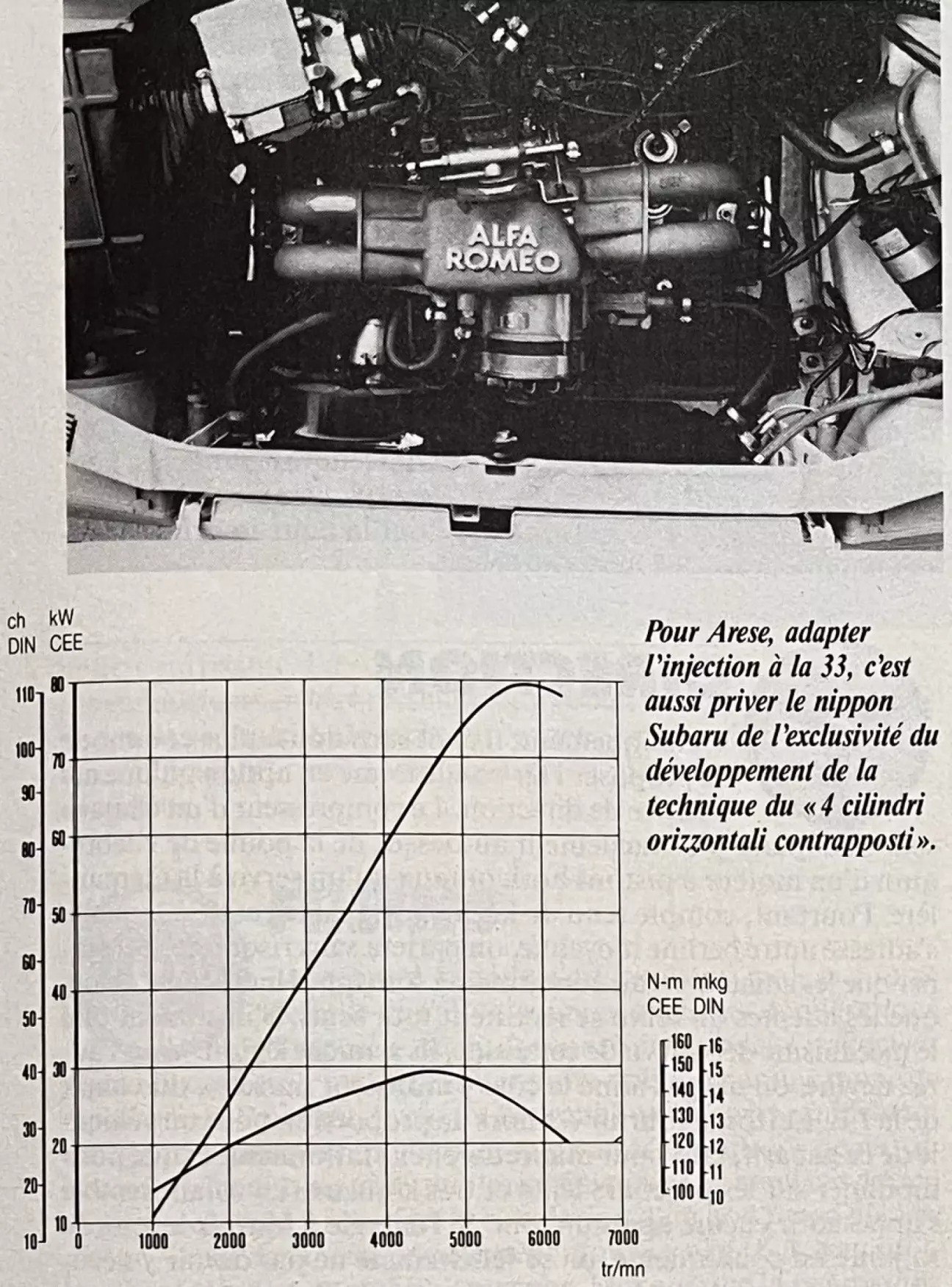 Оппозитный двигатель — это не та механика, которую назовешь просто «красивой»; чтобы им восхититься, его нужно демонтировать. Но даже не имея возможности прийти в экстаз, заглядывая в отведенный ему отсек, вы будете очарованы всем остальным: его объемным впускным коллектором с красными надписями и, прежде всего, его очень характерной работой, благородством нрава, сочным и округлым звучанием, забавными покачиваниями... Установленный продольно на мягких опорах, он колышется в такт перегазовкам, в конечном счете очаровывая и убаюкивая нас. Он сохранил архитектуру 1.7 Q.V. — короткоходный агрегат объемом 1712 куб. см с «линзовидными» камерами сгорания (двухуровневая обработка головки и днища поршня для повышения термодинамического КПД) — и те же технические решения (гидрокомпенсаторы). Однако новая схема питания потребовала изменения профиля кулачков распредвала. Говоря проще, с такими фазами газораспределения двигатель I.E. проявляет себя менее резким, более эластичным и покладистым, чем его «поплавковый» собрат. В ходе этой операции он потерял 8 л.с., а пик кривой крутящего момента сместился на 1000 об/мин выше (148 Нм по стандарту CEE при 4500 вместо 3500 об/мин), однако не опускаясь ниже 142 Нм во второй половине рабочего диапазона (3500–5500 об/мин).