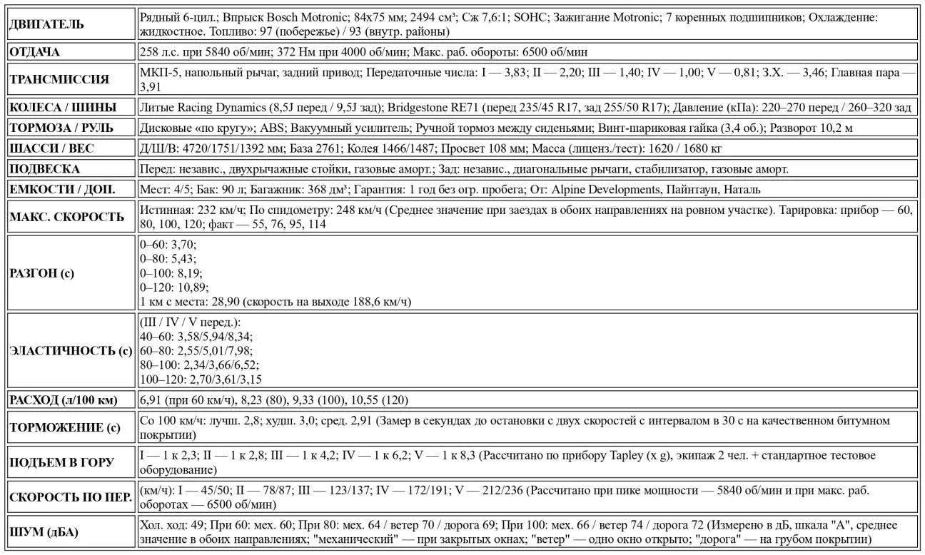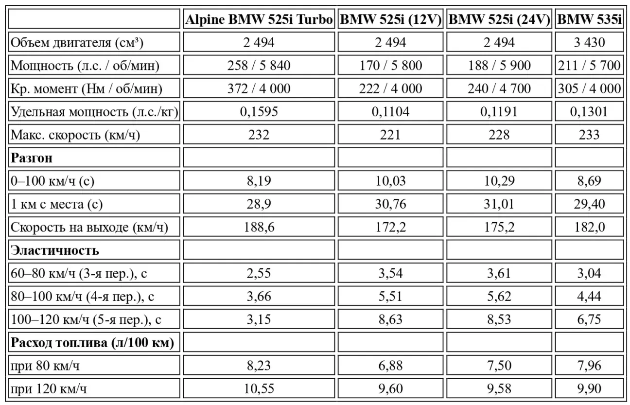Согласно данным динамометрического стенда, предоставленным Alpine Developments, конверсия увеличивает отдачу 2494-кубовой рядной «шестерки» на колоссальные 52 процента — до 258 л.с. почти при тех же пиковых оборотах (5840), добавляя при этом 67 процентов крутящего момента (372 Нм при 4000 об/мин). Что касается дорожных характеристик, она легко опережает в разгоне 211-сильную 535i (см. сравнительную таблицу), не уступая ей в максимальной скорости (232/233 км/ч). А в плане отклика на газ при обгонах, что продемонстрировали наши тесты на эластичность, она оставляет в тени даже 315-сильную M5 с ее 254 км/ч.