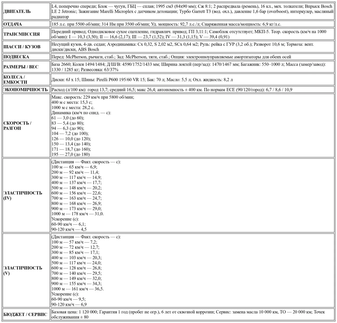 В результате удельная мощность 2-литрового мотора Lancia совершила заметный скачок на 10 л.с./л — с 82,7 до 92,7 л.с./л, в то время как значение крутящего момента в пересчете на литр объема достигло исключительной цифры 157,4 Нм/л. Говоря более предметно, этот «обычный» 4-цилиндровый мотор позволяет Turbo 16V бросить тень на престижную 8.32: согласно нашим замерам декабря 1986 года, новинка способна сравняться с ней в ускорении, показывая 15,3/28,2 секунды против 15,6/28,3 секунды на дистанциях 400 и 1000 метров с места соответственно. Эти результаты ставят ее в один ряд с Mercedes и 21 Turbo. В дисциплине эластичности overboost творит чудеса на фоне атмосферных 16-клапанников, однако не позволяет получить действительно явное преимущество над 2-литровым мотором Renault, чья отзывчивость кажется образцовой на любых режимах. Наконец, по максимальной скорости Turbo 16V логично уступает обтекаемому Mercedes и своей мощной сестре с двигателем Ferrari: 229 км/ч против 232 и 242 км/ч соответственно.