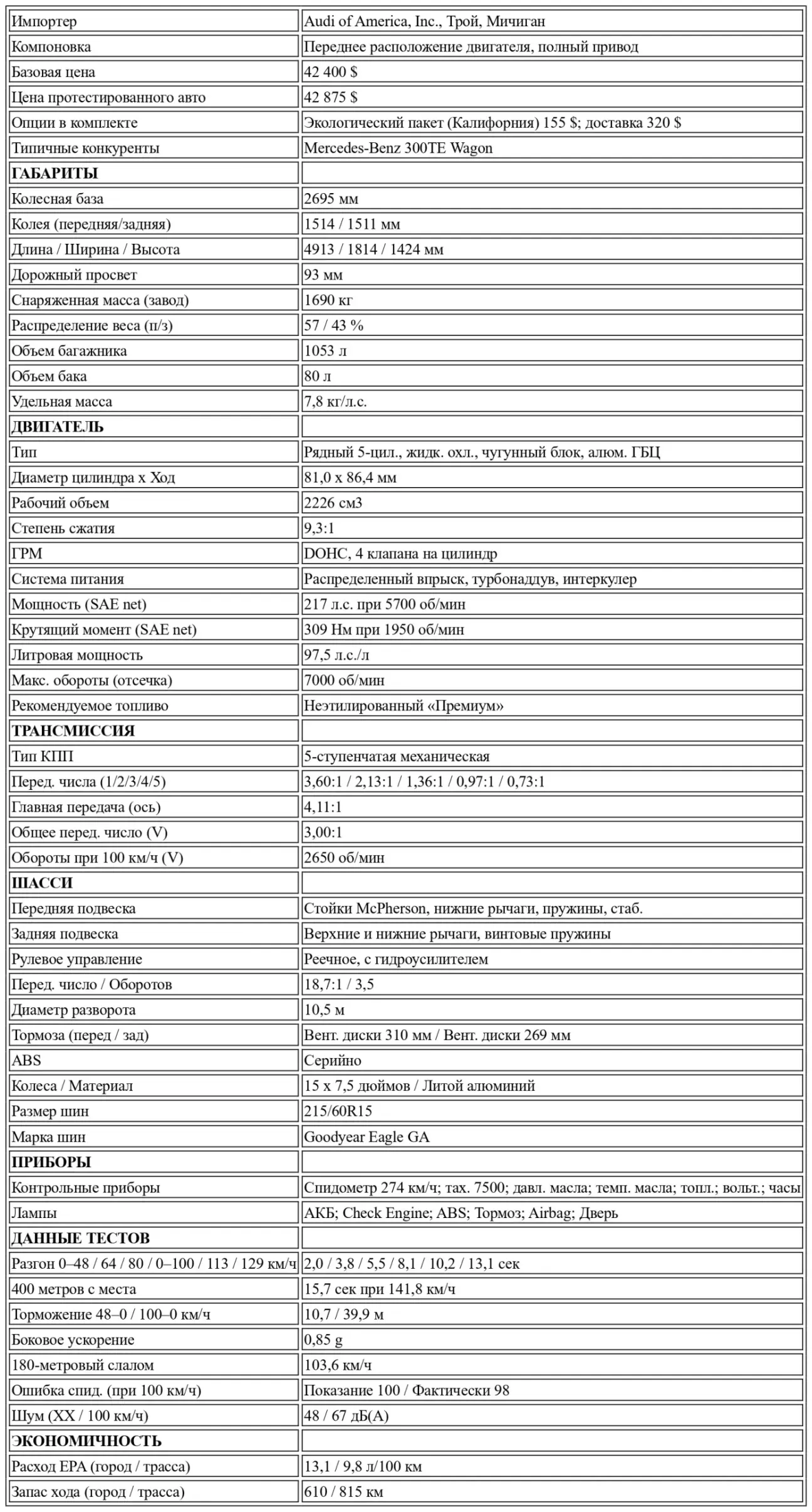 В нашей семье с четырьмя детьми универсал был предметом первой необходимости. Мы проводили отпуска во всём, от Mercury 1962 года до Ford LTD Country Squire 1973 года и микровэна Pinto Runabout 1976-го. Так что поездка на Audi Quattro Wagon стала для меня приятным возвращением в эпоху до появления минивэнов. Внешний вид нашей ярко-красной подопытной, хоть и не отличался экстремальной аэродинамикой, был стильным и гармоничным. Внутри чувствовался ожидаемый класс Audi: раздельные подогревы сидений, цифровой дублер радиостанции на передней панели и отделка полированным деревом. Хотя было весело притворяться водителем маленького спорткара, перебирая пять передач вручную, большинство родителей всё же предпочтут автоматическую трансмиссию. В конце концов, правая рука должна быть свободна, чтобы всыпать детям на заднем сиденье. 217-сильный двигатель, ABS и подушка безопасности делают Quattro Wagon очень сбалансированным предложением. Конечно, цена в 42 400 долларов более чем просто дороговато, но если вы хотите, чтобы ваш семейный транспорт был на голову выше обыденности, это верный путь. — Б. Дж. Хоффман
