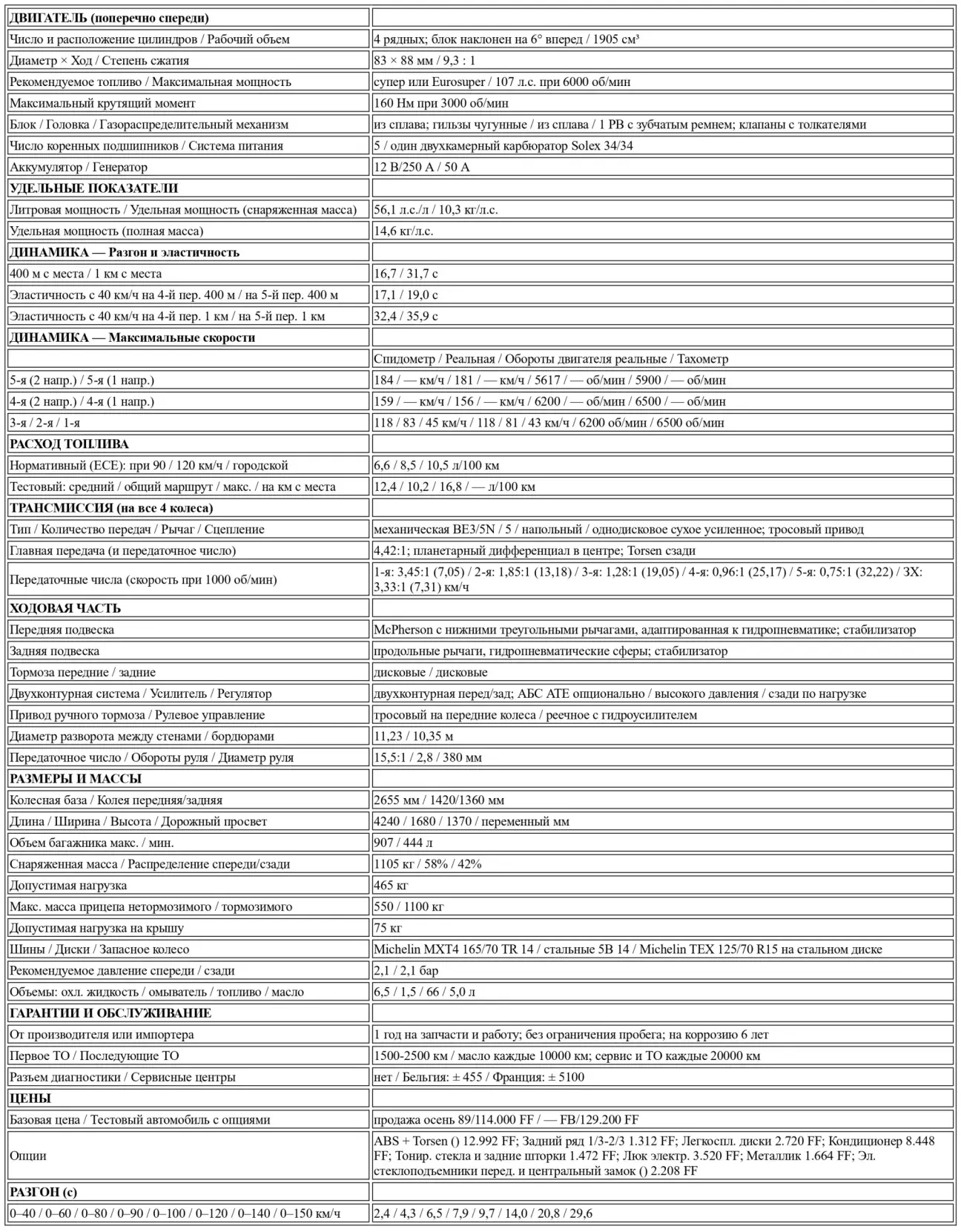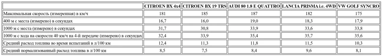 Принятие системы полного привода очевидно влечет за собой существенное увеличение массы автомобиля. Здесь оно составляет 110 килограммов, что дает общую снаряженную массу 1126 кг для «нашего» автомобиля на момент испытаний. Учитывая в целом скромную мощность, можно было опасаться, что мы имеем дело с «овощем». Это не совсем так, поскольку BX 4x4 получил сближенные передаточные числа в коробке передач от 16-клапанной версии, что позволяет частично компенсировать недостаток в виде посредственной удельной мощности. Кроме того, предоставленный нам экземпляр, похоже, был в особенно хорошей форме, так как заявленные производителем — мало вдохновляющие — цифры были попросту разгромлены: 16,7 и 31,7 секунды на дистанциях 400 и 1000 метров с места против обещанных 17,5/32,6. При этом 4x4 действительно уступает версии 19 TRS, на которой мы в свое время также получили выдающиеся результаты — 16,0 и 30,8. С другой стороны, полноприводная версия сполна использует свою «короткую» коробку, чтобы на тесте эластичности «навешать» своей сестре 4x2 и конкурентам от Audi и Lancia, которые также получают жесткую трепку при разгоне. Напротив, по максимальной скорости BX 4x4 находится как раз на среднем уровне с честными 180 км/ч. Словом, итоговый цифровой баланс в конечном счете удовлетворителен, а удовольствие от вождения было умело сохранено: отличный подбор передаточных чисел обеспечивает очень хорошую отзывчивость двигателя на любых скоростях.