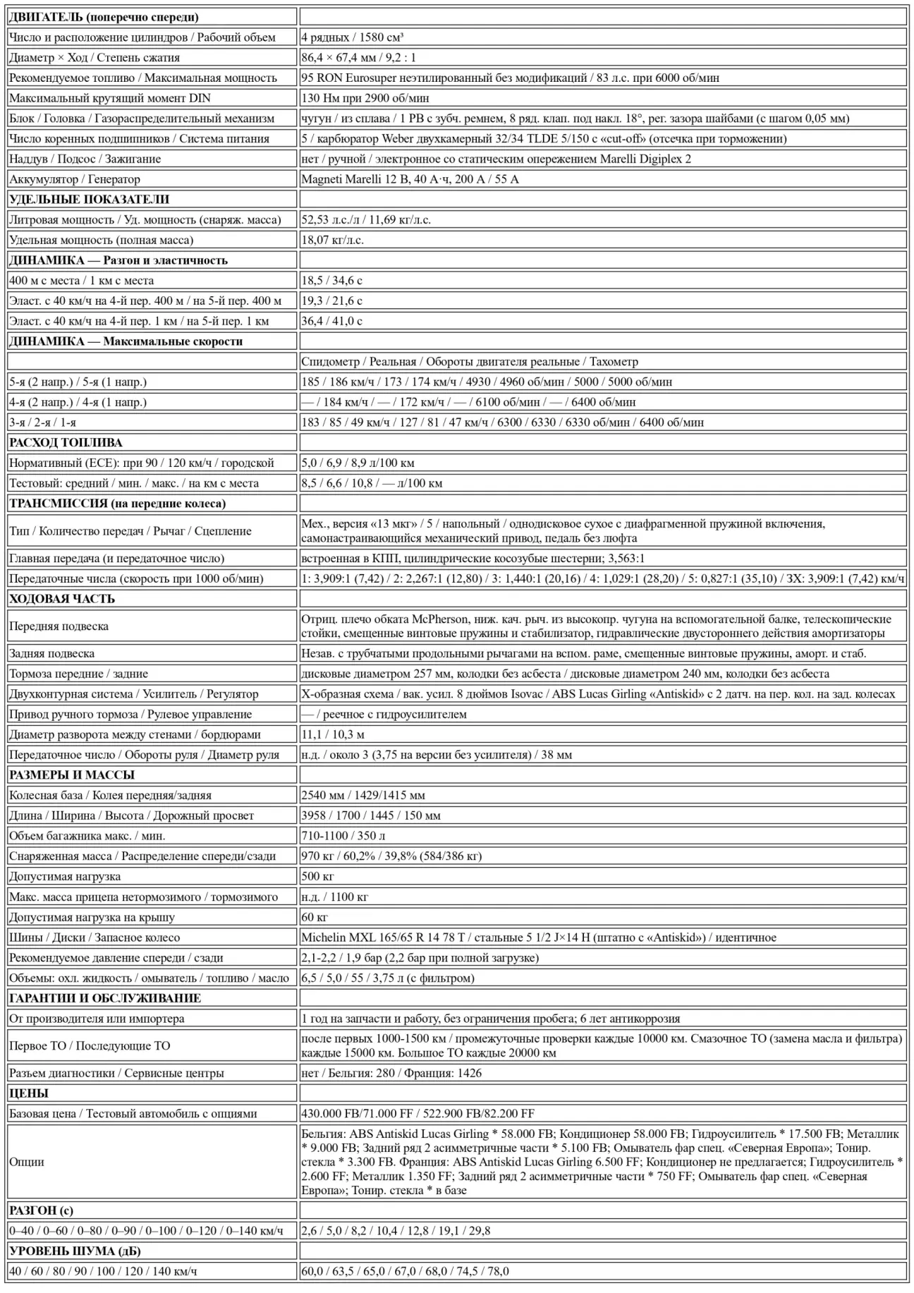 Здесь также прослеживается четкая преемственность семейств двигателей, происходящих либо от блока Fire объемом 999 куб. см моделей Panda и Uno (вариант 1108 куб. см), либо от 70-сильного агрегата 1301 куб. см модели Uno SX и базовой Regata (версия 1372 куб. см и наш 1580 куб. см). В последнем случае рабочий объем был получен путем увеличения диаметра цилиндра с 80,5 до 86,4 мм при неизменном ходе поршня (67,4 мм). Попутно литровая мощность немного снизилась с 53,8 л.с./л до 52,5 л.с./л. Это результат небольших периферийных доработок, проведенных тут и там для адаптации двигателя 1580 куб. см к все более строгим экологическим нормам и подготовки его к оснащению электронным впрыском с каталитическим нейтрализатором и лямбда-зондом. Такие версии уже доступны в странах со специальным законодательством по выбросам. Так, был изменен впускной коллектор для улучшения наполнения цилиндров и повышения момента на низких оборотах; измененные каналы и увеличенные клапаны позволяют головке блока оптимизировать термодинамический обмен. Таковы, вкратце, настройки, позволяющие двухкамерным карбюраторам работать на неэтилированном бензине Eurosuper (95 RON) взамен предписанного Super (98 RON). Мы не проверяли разницу в характеристиках и расходе, которую влечет за собой такое применение. Производитель, со своей стороны, уверяет, что ее нет… Впрочем, это все же заинтересует бельгийских автомобилистов — скорее не из-за их заботы о природе, а из-за ажиотажа, вызванного в последнее время налоговой скидкой в 2 бельгийских франка на литр топлива из «зеленых» колонок королевства.