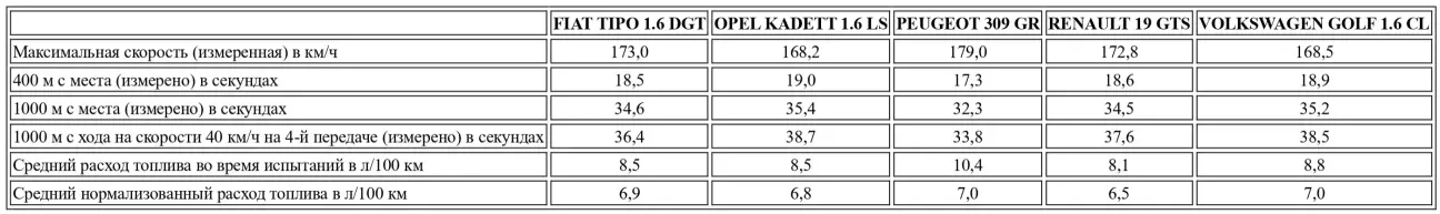 Признаемся сразу: этот экземпляр цвета «зеленый металлик» не смог повторить высокие результаты бордового DGT из сравнительного теста в номере 911. Этот Fiat Tipo предпочел сравняться с цифрами, которые Renault 19 GTS показал во время своего первого противостояния с итальянцем. Впрочем, теоретически логика соблюдена, так как оба автомобиля обладают одинаковой удельной мощностью, при этом француз обделен крутящим моментом. Тем не менее, настройка этого второго Fiat Tipo показалась нам безупречной. Перечислим его показатели в секундах, сопровождая их в скобках данными первого Fiat Tipo, также измеренными нами, соответственно для разгона 0–100 км/ч, 0–400 м, 0–1000 м, эластичности с 40 км/ч на 4-й передаче на дистанциях 400 м и 1000 м, и, наконец, на 5-й передаче на 400 м и 1000 м: 12,8 (11,7) — 18,5 (17,9) — 34,6 (33,6) — 19,3 (18,3) — 36,4 (34,5) — 21,6 (20,5) — 41,0 (38,4). Результаты R19 GTS в том же порядке: 12,8 — 18,6 — 34,5 — 20,4 — 37,6 — 22,1 — 42,0. Для Fiat Tipo 1.6 DGT Турин заявляет 12 сек., 33,9 сек., 35,7 сек. и 172 км/ч соответственно для разгона 0–100 км/ч, 1000 м с места, эластичности на 4-й передаче на 1000 м с 40 км/ч и максимальной скорости на 5-й передаче. Если по максимальной скорости мы близки к этим цифрам, то в остальных случаях истина, должно быть, лежит в среднем арифметическом. Отметим, что специфический для DGT цифровой тахометр (произносится «диджит» по-итальянски, и теперь пишется только сокращенно, так как Citroën защитил полное название для одной из своих спецверсий) поначалу ввел нас в заблуждение во время замеров. Впоследствии мы оставили его лгать в одиночестве, чтобы лучше выжать из машины всё, на что она способна. Отсутствие ограничителя оборотов немного помогло. И все же…