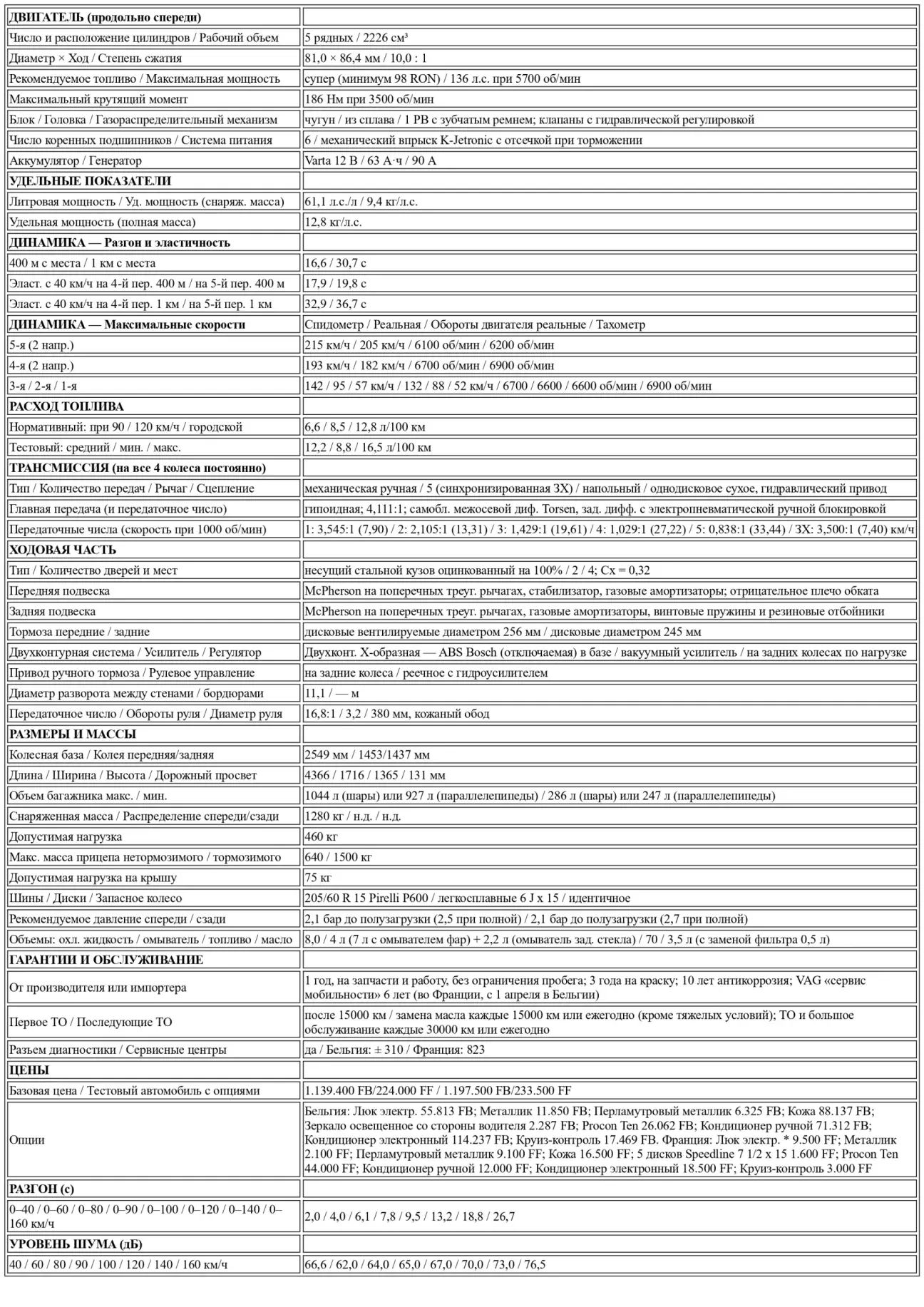 Для полноты картины добавим, что наш 2,2-литровый мотор в 136 л.с. — единственный вариант для переднеприводных и полноприводных Coupé, продающихся во Франции. Многоклапанник (20V) с 2 распредвалами ожидается во втором квартале, но только в немецкой 2,3-литровой версии (2309 куб. см с катализатором — обязателен неэтилированный Eurosuper!, 170 л.с. при 6000 об/мин и 220 Нм при 4500 об/мин). «Другой» 2,0-литровый 20-клапанник от модели 90 (без катализатора, изначально предназначенный для итальянского рынка с его налоговыми льготами на этот объем, 160 л.с. при 6200 об/мин и 197 Нм при 4500 об/мин) не был выбран VAG France для заполнения пустующей ниши. И справедливо: его характеристики были сочтены недостаточно убедительными. Между тем в Бельгии он исполняет роль временного варианта. В связи с этим наша бельгийская редакция добавляет краткий отчет об этой версии по следам данного теста. В очередной раз отметим, что 160-сильный 20V делает ту же машину дороже на 16% (не без помощи 8-процентного налога на роскошь для авто мощнее 116 кВт/158 л.с.)... ради нескольких жалких лишних км/ч «максималки» (213 вместо 205 у 136-сильной версии). При этом в дисциплине ускорения он остается ни с чем, а его эластичность и вовсе катастрофична (он уступает 136-сильному мотору от 2 до 3 секунд при разгоне с 40 км/ч на 4-й и 5-й передачах соответственно!). В конечном счете, платить больше, чтобы получить ощущение тяжести: 20V настолько пуст «внизу», что заставляет постоянно ехать «педаль в пол».