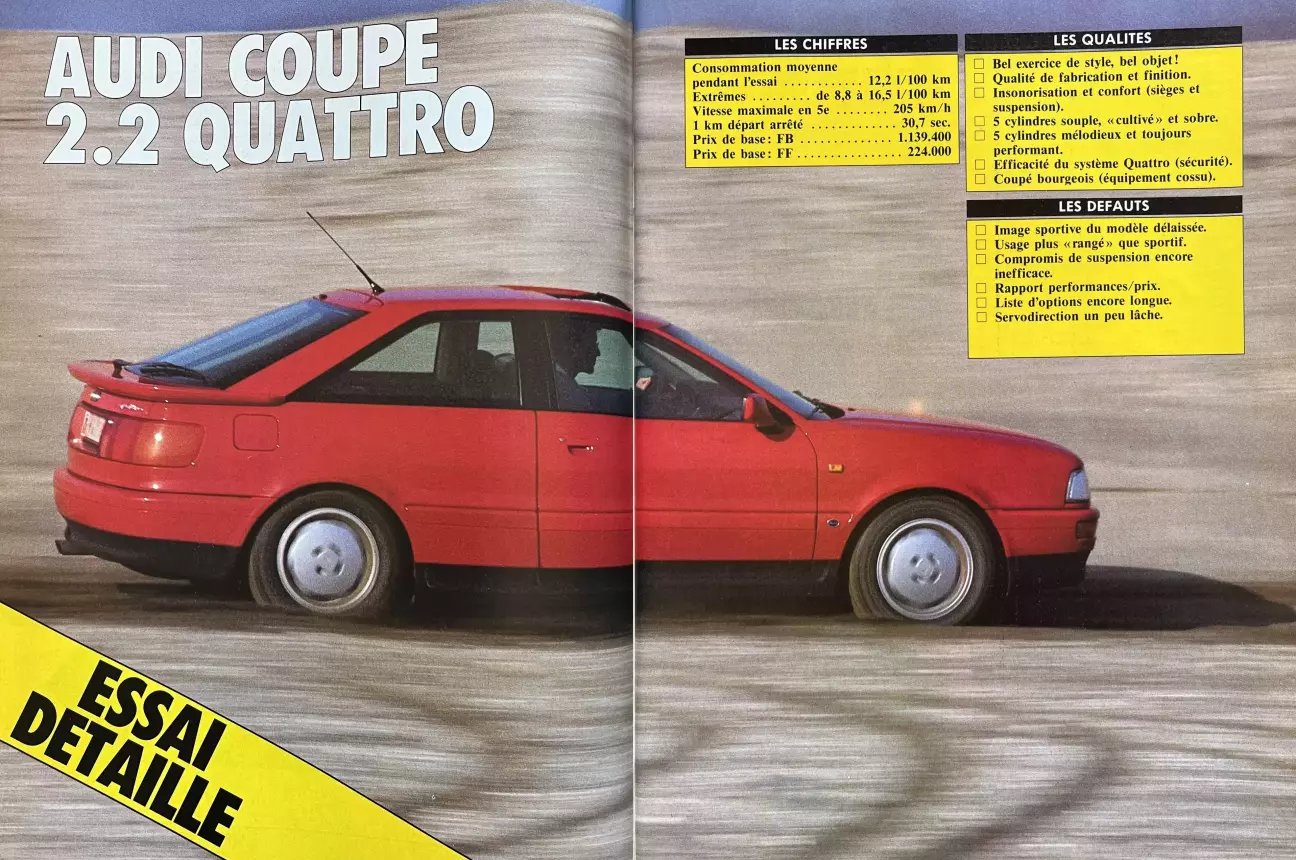 Перевод подробного теста Audi Coupe B3 2.2 Quattro от бельгийского автомобильного журнального издания Le Moniteur de l’Automobile, № 921, Март, 1989.