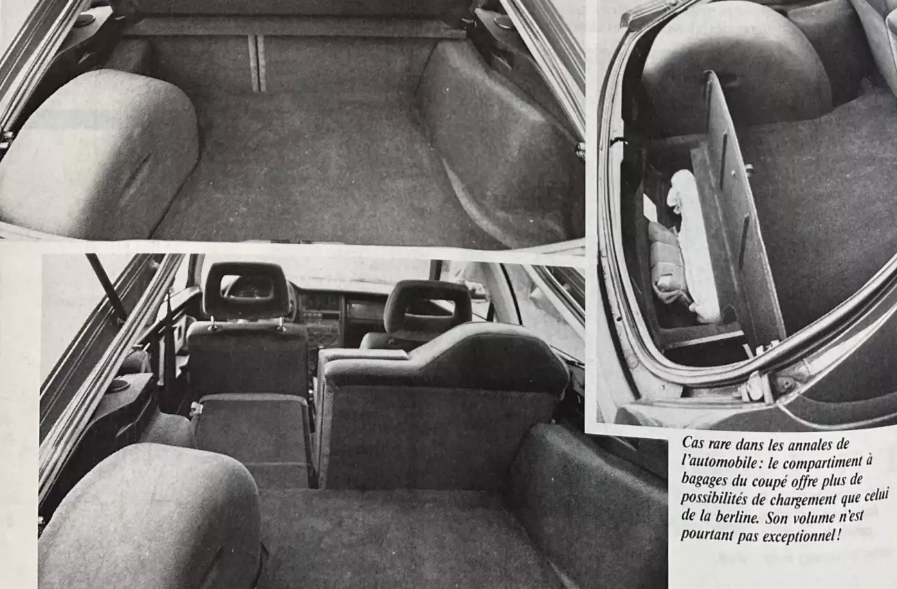 Отсутствие форточек в задних боковых окнах шокирует еще больше (снова авто для эгоистов, которым вечно не хватает воздуха!). Багажник, открываемый великолепной пластиковой пятой дверью с большой площадью остекления и газовыми упорами, менее скуп: даже его минимальный объем в 286 литров (при поднятых спинках 2/3-1/3) использовать легче, чем 375 литров максимального объема седана Quattro. Разница в том, что здесь мешает порог, закрывающий его на манер неподвижного борта (правда, оформленный изящнее: широким цветным катафотом). Полка багажника относится к качественным аксессуарам: хорошо спроектированная, правильно закрепленная и бесшумная, она заставляет забыть о дешевых и плохо подогнанных полках, часто встречающихся в других машинах. Завершают облик заниженная крыша и сильно наклоненные стекла (лобовое и заднее), придающие автомобилю истинный дух элегантного купе. Эту породистость не могут испортить ни тяжелые юбки в цвет кузова, ни массивный спойлер на корме. Все эти элементы в совокупности создают исключительную гармонию, увенчанную короткой наклонной антенной на крыше с усилителем, которая придает машине сходство с маленьким спутником.