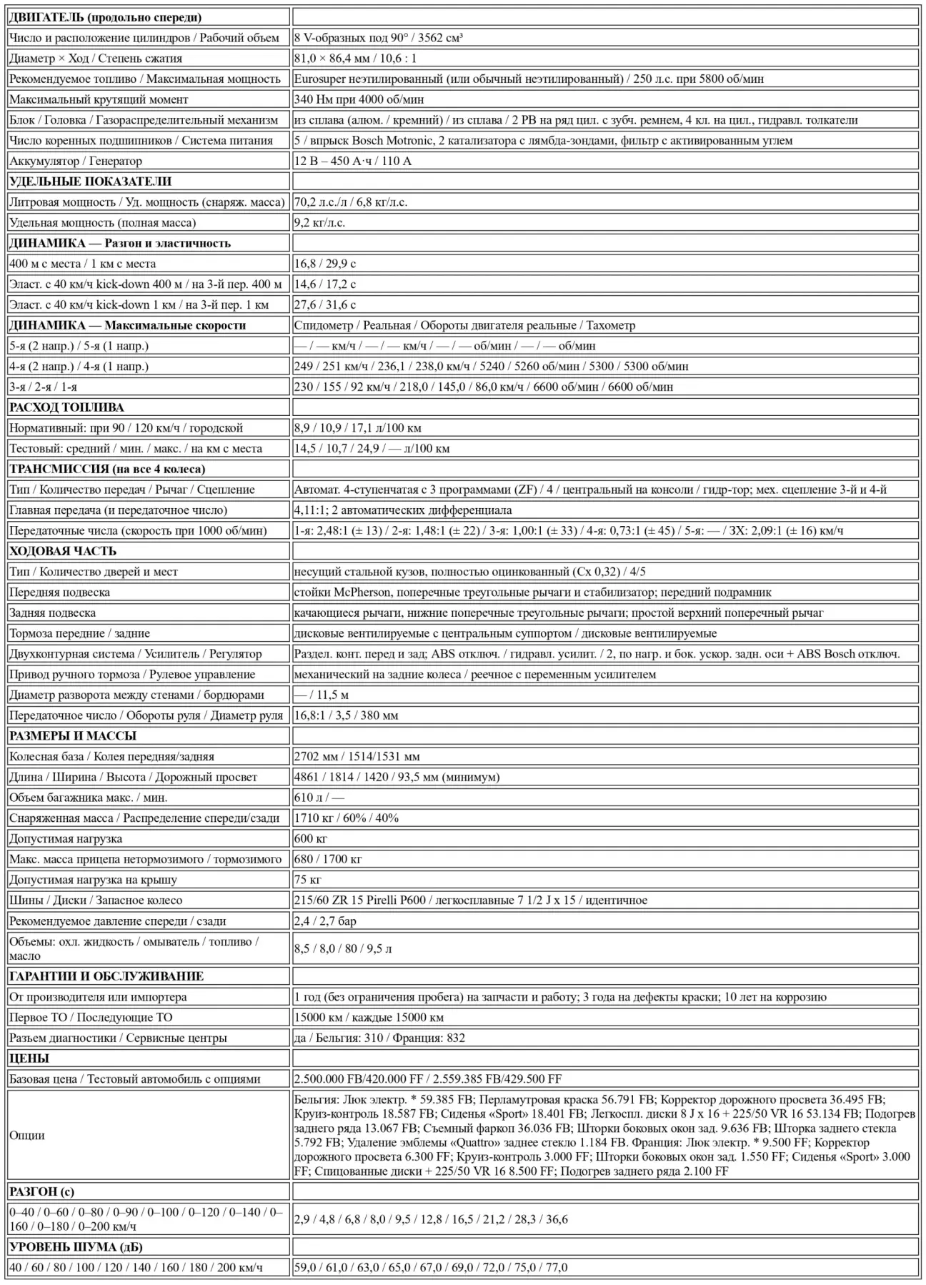 С чисто технической точки зрения новый V8 — это, безусловно, венец инженерной мысли: четыре распределительных вала, 32 клапана, рабочий объем 3,6 литра и мощность 250 л.с. Но мы вернемся к этому подробно в главе «Двигатель». Этот агрегат, расположенный продольно, сильно смещен вперед, чтобы оставить достаточно места для новой четырехступенчатой автоматической коробки передач ZF, полностью управляемой электроникой, которая позволяет выбирать между тремя программами: economy, sport и manual. Эта коробка передает внушительный крутящий момент на все четыре колеса, причем делает это постоянно через самую совершенную систему 4х4, которую когда-либо предлагала Audi. Больше никаких ручных блокировок: два полностью автоматических дифференциала — центральный и задний. Первый работает через многодисковую муфту, второй — по принципу Torsen. Независимая подвеска всех колес, вентилируемые диски на обеих осях (нового типа спереди) и серийная ABS. Также стоит отметить, что V8 без доплаты оснащается системой безопасности Procon-Ten.