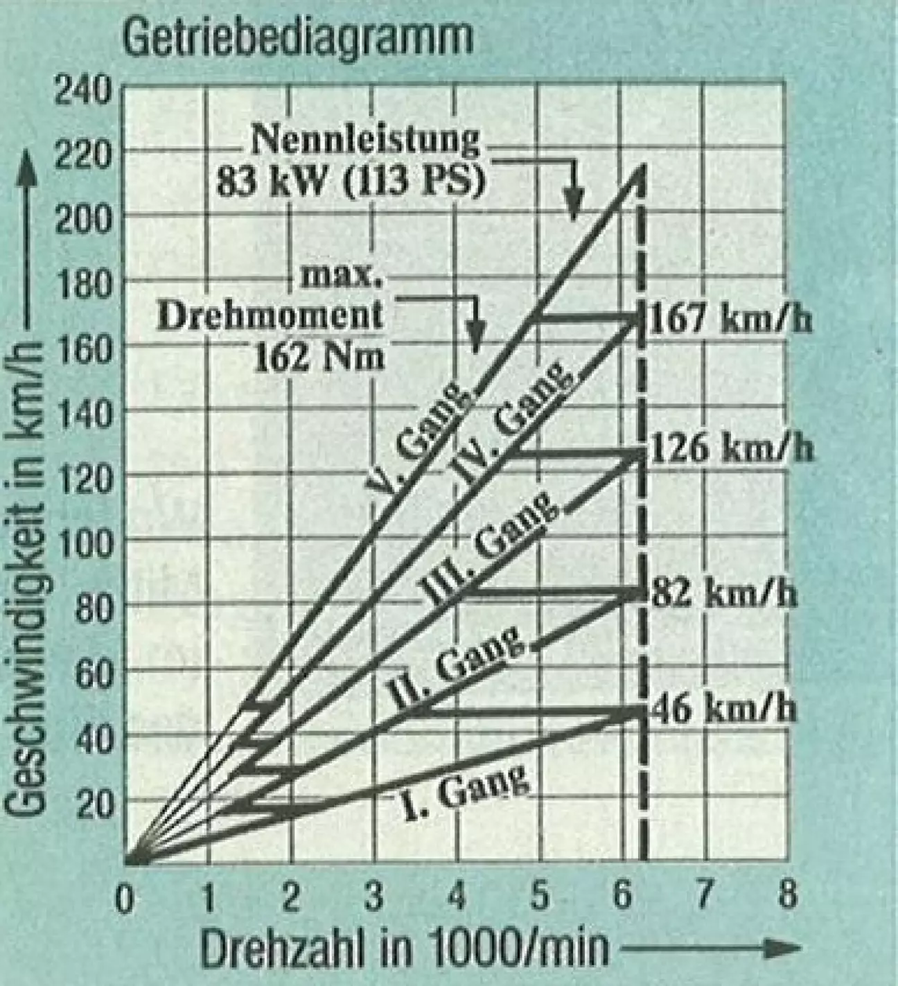 Из-за модифицированной главной передачи (4,27 у 518i против 4,45 у 520i) при неизменных передаточных числах пятиступенчатой коробки передач уровень оборотов у четырехцилиндровой BMW чуть ниже. Тем не менее, очевидно более выгодная кривая крутящего момента обеспечивает не только субъективное ощущение лучшей тяги, чем у 520i, но и подтверждается реальными замерами.