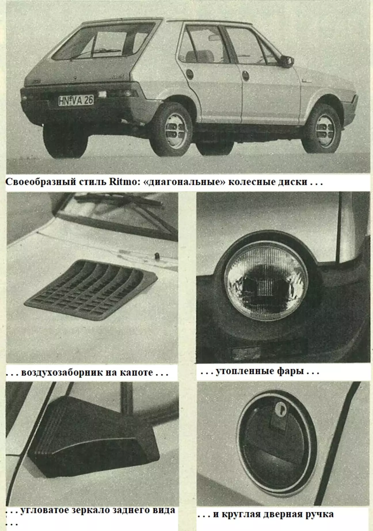 Атака Fiat запоздала, и предпринята она на территории, прочно удерживаемой немцами. Ведь на рынке компактных хэтчбеков с объемом двигателя до 1,5 литра с 1974 года доминирует VW Golf. Туринский ответ успешному выходцу из Вольфсбурга получил имя Fiat Ritmo, и с ним итальянцы намерены «в ближайшие пять лет достичь исключительно сильных позиций на рынке» (из пресс-релиза Fiat). Одновременно с этим Fiat хочет противопоставить Ritmo стилистической скуке, царящей в нижнем среднем классе. «При его разработке, — уверяет Джампаоло Боано, глава центра стиля Fiat в Турине, — мы принципиально не оглядывались на то, что уже предлагают наши конкуренты». Так, в работе над Ritmo принимали участие не только стилисты с автомобильным прошлым, но и дизайнеры, способные подойти к самодвижущемуся проекту без предубеждений — например, дизайнеры мебели, которых концерн Fiat специально нанял для генерации новых идей. Такая непредвзятость в облике Ritmo, несомненно, прослеживается. Хотя общие линии кузова вполне соответствуют канонам нижнего среднего класса, именно детали в конечном итоге заставляют новый Fiat выглядеть симпатично «иначе» — взять хотя бы шестиугольное заднее окно или, конечно, неконвенционально оформленные колесные диски, чьи матово-черные, расположенные по диагонали декоративные элементы спереди и сзади крайне редко оказываются выровнены, к досаде педантичных фотографов.