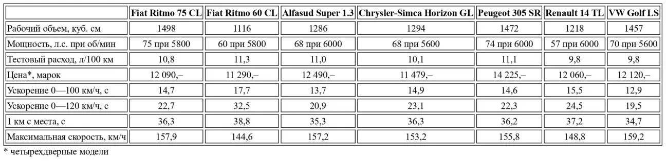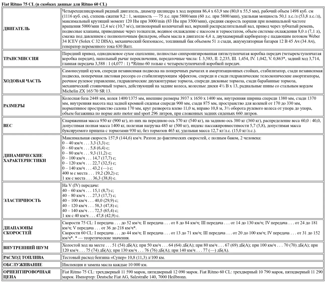 Fiat борется за немецких покупателей с тремя моделями Ritmo, при этом оба исполнения CL (Confort Lusso = Комфорт Люкс) оправдывают свое амбициозное название. За исключением непонятным образом сэкономленной второй скорости стеклоочистителей, «люксовые» Ritmo предлагают в стандартной комплектации всё — от многослойного лобового стекла до очистителя заднего стекла, — что вольфсбургские коммерсанты предпочитают отправлять в прибыльные списки платных опций. Версию Confort Lusso можно заказать на выбор либо с 60 л.с. при рабочем объеме 1116 куб. см, либо с 75 л.с. и 1498 куб. см по цене от 10 790 марок (Ritmo 60 CL, трехдверный) до 12 090 марок (Ritmo 75 CL, пятидверный). Именно этими двумя вариантами занимается auto motor und sport в данном тесте. Ступенью ниже располагается более просто оснащенная версия 60 L, которая при цене 9990 марок (трехдверная) стоит ровно столько же, сколько заслуженный конкурент из собственного дома — продолжающий выпускаться Fiat 128. От него Ritmo унаследовал как поперечно расположенный двигатель, так и концепцию ходовой части.