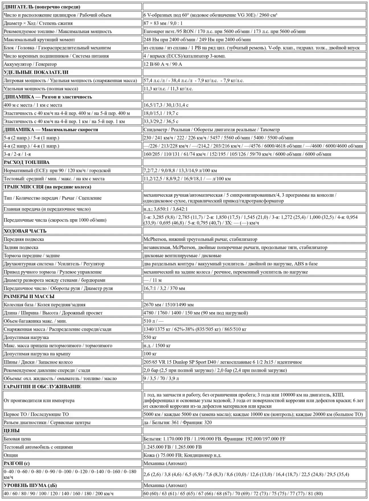Впервые представленная в Европе на Женевском автосалоне, Maxima уже более года продается в Японии и США. Это переднеприводный автомобиль, что вполне логично для модели, изначально ориентированной на американский рынок. Под капотом скрывается старый знакомый — двигатель VG30E, позаимствованный у 300 ZX. Этот трехлитровый V6 развивает 170 л.с. в простейшем исполнении с двумя клапанами на цилиндр. На выбор предлагаются пятиступенчатая механическая коробка передач или четырехдиапазонный автомат с тремя программами переключения. Поскольку статистика свидетельствует о том, что все больше покупателей в этом классе отдают предпочтение автоматическим трансмиссиям, а некоторые читатели упрекают нас в игнорировании таких версий, в рамках данного теста мы решили провести очную ставку двух модификаций. Эту практику мы намерены продолжать и в будущем, если позволят обстоятельства и наличие парка пресс-парка.