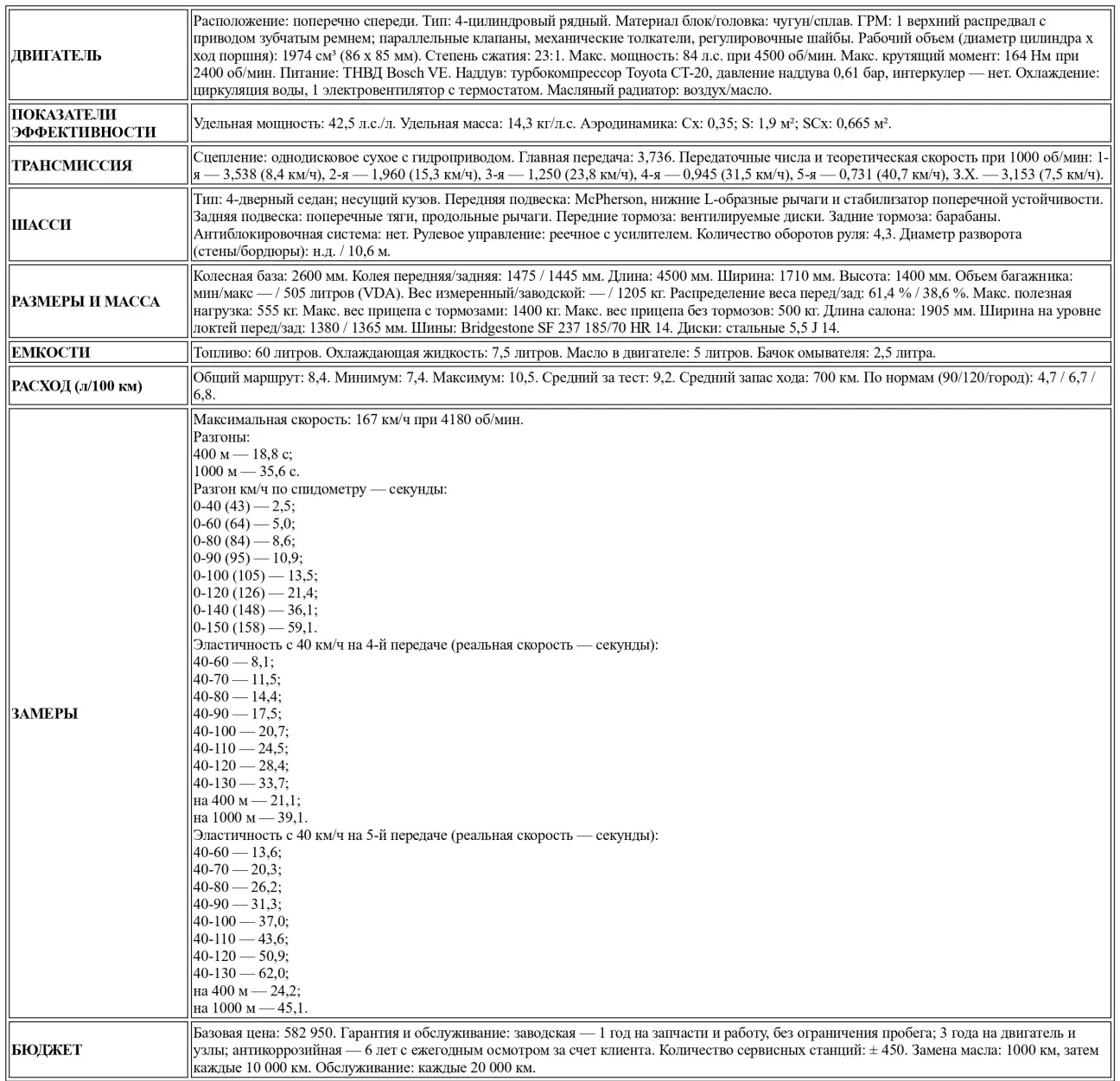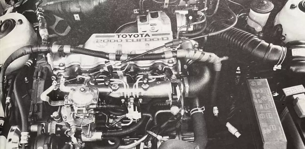 Двигатель 2C-T — 1974 см³, 84 л.с. — на Toyota Camry TD того же пошиба: он современный, легкий и использует ряд авангардных технических решений, в частности поршни из армированного волокном металла (FRM) с днищами из высокопрочной промышленной керамики, устойчивой к нагреву и износу. Однако этот турбодизель не во всех дисциплинах идет в ногу со временем: он по-прежнему использует регулировочные шайбы для выставления зазоров в клапанном механизме и не счел нужным обзавестись промежуточным охладителем наддувочного воздуха (интеркулером). Последнее уточнение заставляет его удельную мощность соответствовать показателю двухлитрового мотора Renault 21: 42,5 л.с./л.