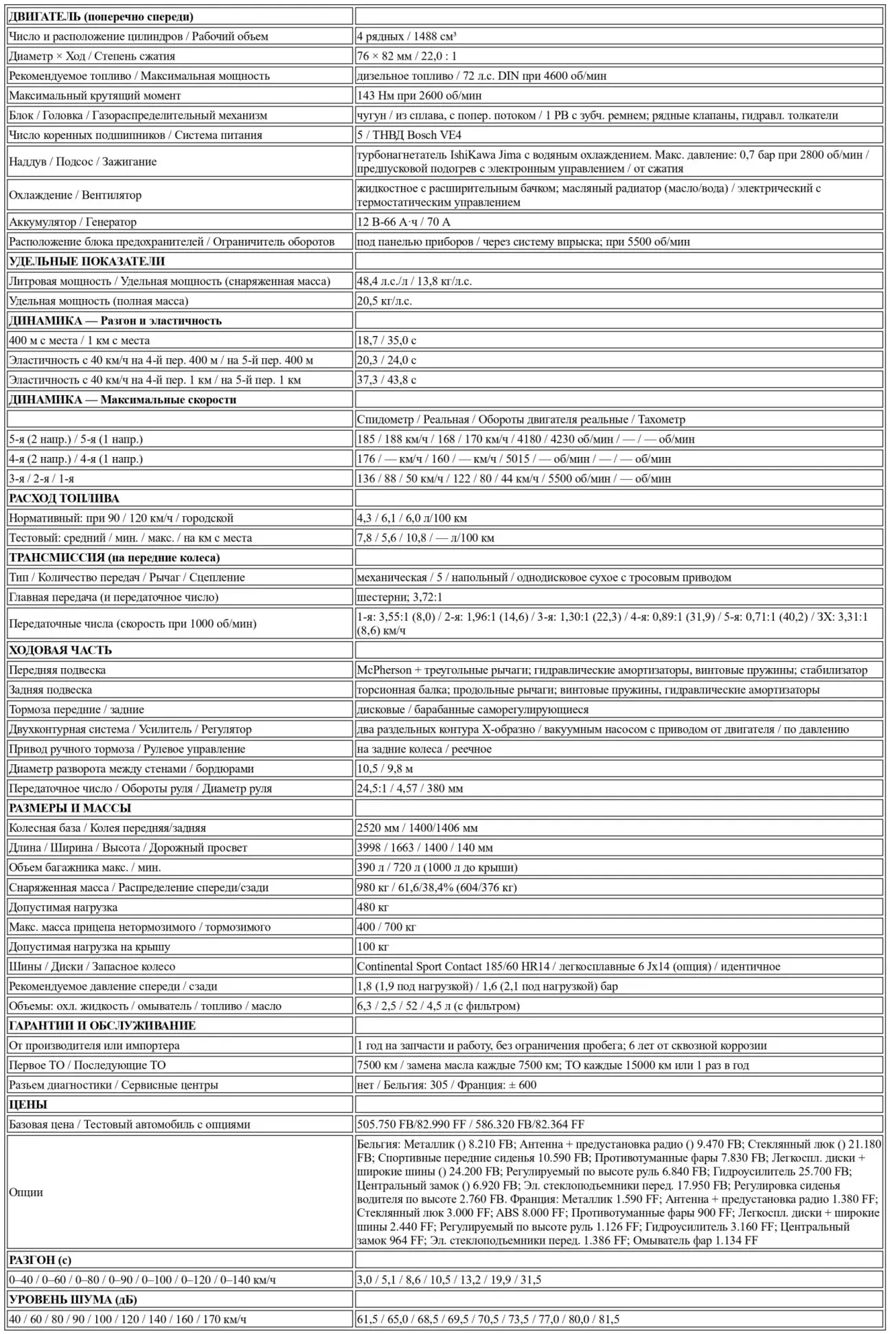 Как и в случае с Corsa, энергетический баланс выглядит как минимум выгодным с учетом уровня характеристик. Конечно, на более тяжелой машине, оснащенной интеркулером, единственная цель которого — увеличить мощность, расход будет чуть выше (ошибочно полагать, что интеркулер повышает КПД дизельного двигателя: воздух, поступающий в камеру сгорания, будучи охлажденным, обладает большей плотностью, что позволяет впрыскивать соответственно большее количество топлива). Средний расход за наш тест, проведенный в бодром темпе, составил 7,8 л/100 км: нет повода ни для скандала, ни для чуда, если вспомнить 8,1 л/100 км у Golf или 7,7 л/100 км у Peugeot 309. Расход может подскочить почти до 11 л/100 км при постоянно выжатой педали газа, но обычно стабилизируется между 7 и 8 литрами при нормальном использовании потенциала машины.