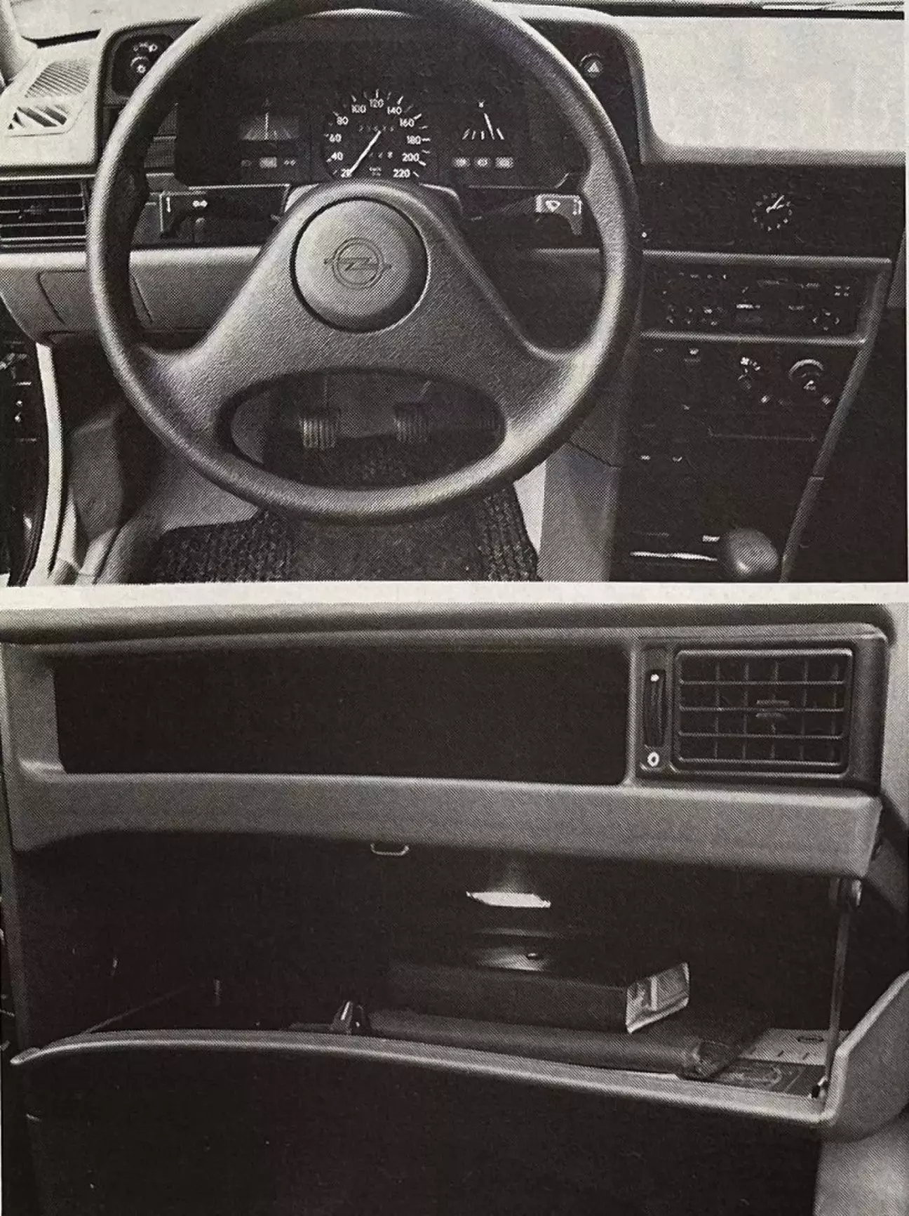 Kadett 89: неужели Opel решился нарисовать чуть более элегантную приборную панель, дополнить щиток приборов, улучшить качество пластика и усилить крепления? Отрицательно. По всем пунктам. Максимум, на что можно рассчитывать — это новые, более крупные цифры на спидометре, кнопки вентиляции и управления светом теперь не круглые, а вытянутые... и это почти всё. Полка над багажником и крышка перчаточного ящика по-прежнему болтаются, управление отопителем расположено так же низко, приборный щиток столь же архаичен и пуст (тахометра всё еще нет), а вид передней панели такой же грустный, массивный и лишенный элегантности, как и прежде (таково мнение многих). Пока японцы тратят время на проработку эстетики, а VW — на качество, Opel уходит в сторону легковесной отделки. Жаль. Если GL означает Grand Luxe (Большой Люкс), почему мы не получаем автоматически такие порой полезные, а порой просто приятные вещи, как центральный замок, передние электростеклоподъемники, регулировку водительского сиденья по высоте или радиоподготовку в дополнение к тонированным стеклам, спинке 1/3–2/3, двум зеркалам с внутренней регулировкой (в базе с LS), ремням с регулируемым анкером (также на LS) и велюровым сиденьям, устанавливаемым серийно? Или, раз уж на то пошло, руль и набалдашник рычага, обшитые кожей?